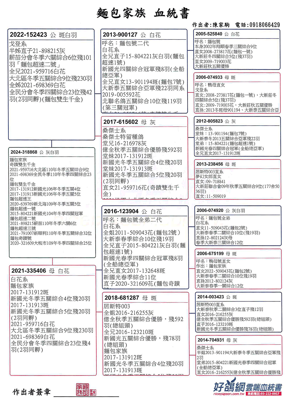 陳家駒表示,麵包家族在賽場上不論是綜合或是單關成績都能有亮眼表現,須歸功於原本優質的好鴿底與近親作育的方式。多年以來,透過旁系(叔、甥舅)互配近親作出為主,作出後選手鴿或是特留種鴿皆宜。我們可以從麵包家族的成績印證近親育方式是已經成為一套勝利方程式。所以才能在低歸返成數能名列前茅、在好天氣又能單關入賞的好表現!