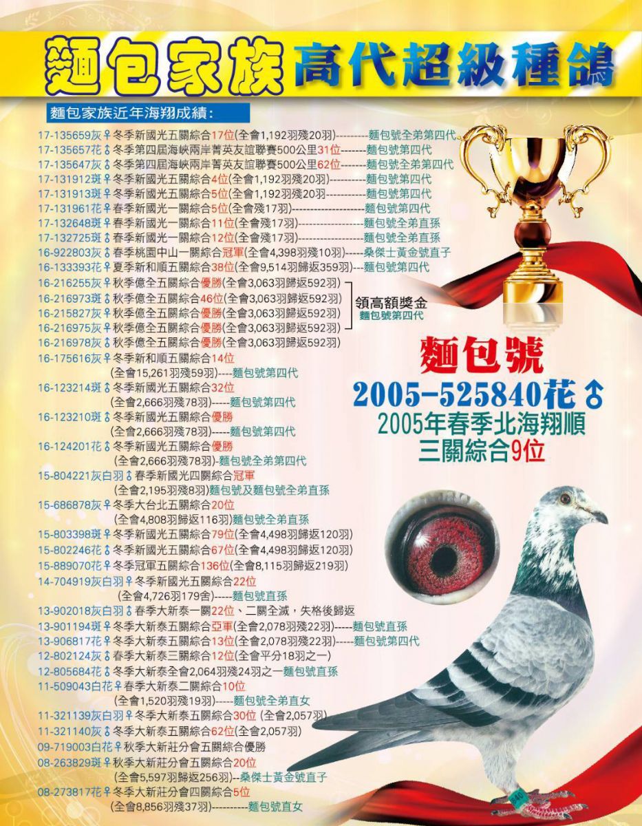 麵包家族基礎種鴿群主要是以:戈登(鴨母03-026949班)、白花(麵包號05-525840白花古)及桑杰士(黃金號05-525831灰三系)為基礎再以此鴿系相互融合,近年引進的居斯特003等四大鴿系締造麵包家族輝煌的成績。