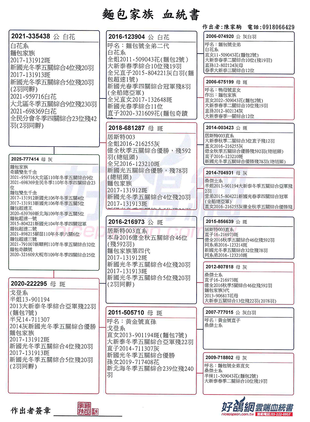 陳家駒表示,麵包家族在賽場上不論是綜合或是單關成績都能有亮眼表現,須歸功於原本優質的好鴿底與近親作育的方式。多年以來,透過旁系(叔、甥舅)互配近親作出為主,作出後選手鴿或是特留種鴿皆宜。我們可以從麵包家族的成績印證近親育方式是已經成為一套勝利方程式。所以才能在低歸返成數能名列前茅、在好天氣又能單關入賞的好表現!