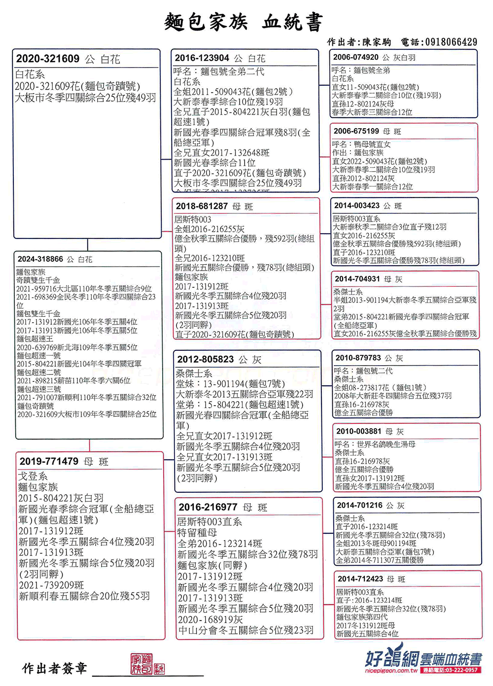 陳家駒表示,麵包家族在賽場上不論是綜合或是單關成績都能有亮眼表現,須歸功於原本優質的好鴿底與近親作育的方式。多年以來,透過旁系(叔、甥舅)互配近親作出為主,作出後選手鴿或是特留種鴿皆宜。我們可以從麵包家族的成績印證近親育方式是已經成為一套勝利方程式。所以才能在低歸返成數能名列前茅、在好天氣又能單關入賞的好表現!