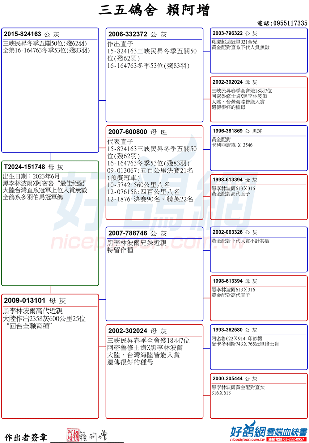 三五鴿舍賴阿增憑藉著已適應台灣氣候又易於融合的本土鴿系,以這四大支柱為基礎,四大鴿系彼此融合性強,兼具速度及適應惡劣氣候的特性,多年來不混入另外的鴿系以自己的紀錄鴿配紀錄鴿,實戰紀錄加上彼此融合的血系早已自成一格,三五鴿系才得以不斷創造佳績的。
