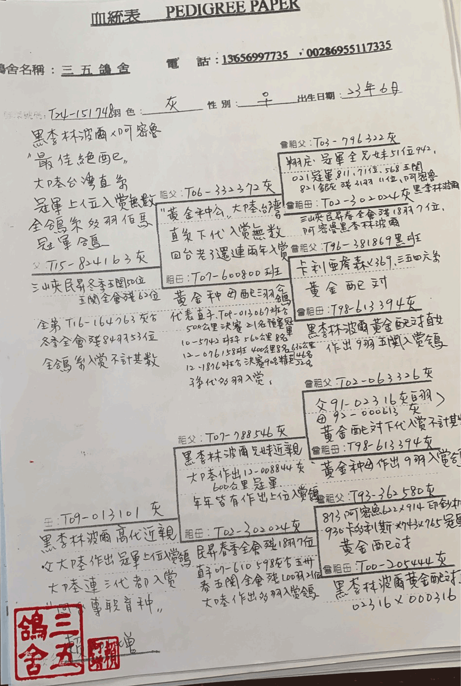 (2)超級種母T83-29914 斑♀"印鈔機",本身入賞72年冬季四關綜合亞軍,印鈔機總共與7羽公鴿配對,每羽的配對直子都得到冠軍,其直系下代翔完五關也超過百羽以上。
