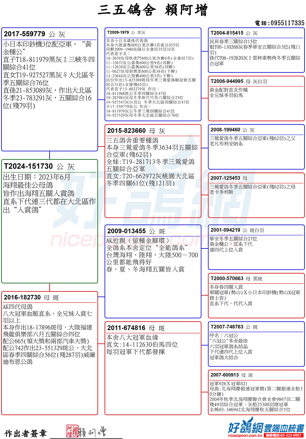 三五鴿舍賴阿增憑藉著已適應台灣氣候又易於融合的本土鴿系,以這四大支柱為基礎,四大鴿系彼此融合性強,兼具速度及適應惡劣氣候的特性,多年來不混入另外的鴿系以自己的紀錄鴿配紀錄鴿,實戰紀錄加上彼此融合的血系早已自成一格,三五鴿系才得以不斷創造佳績的。
