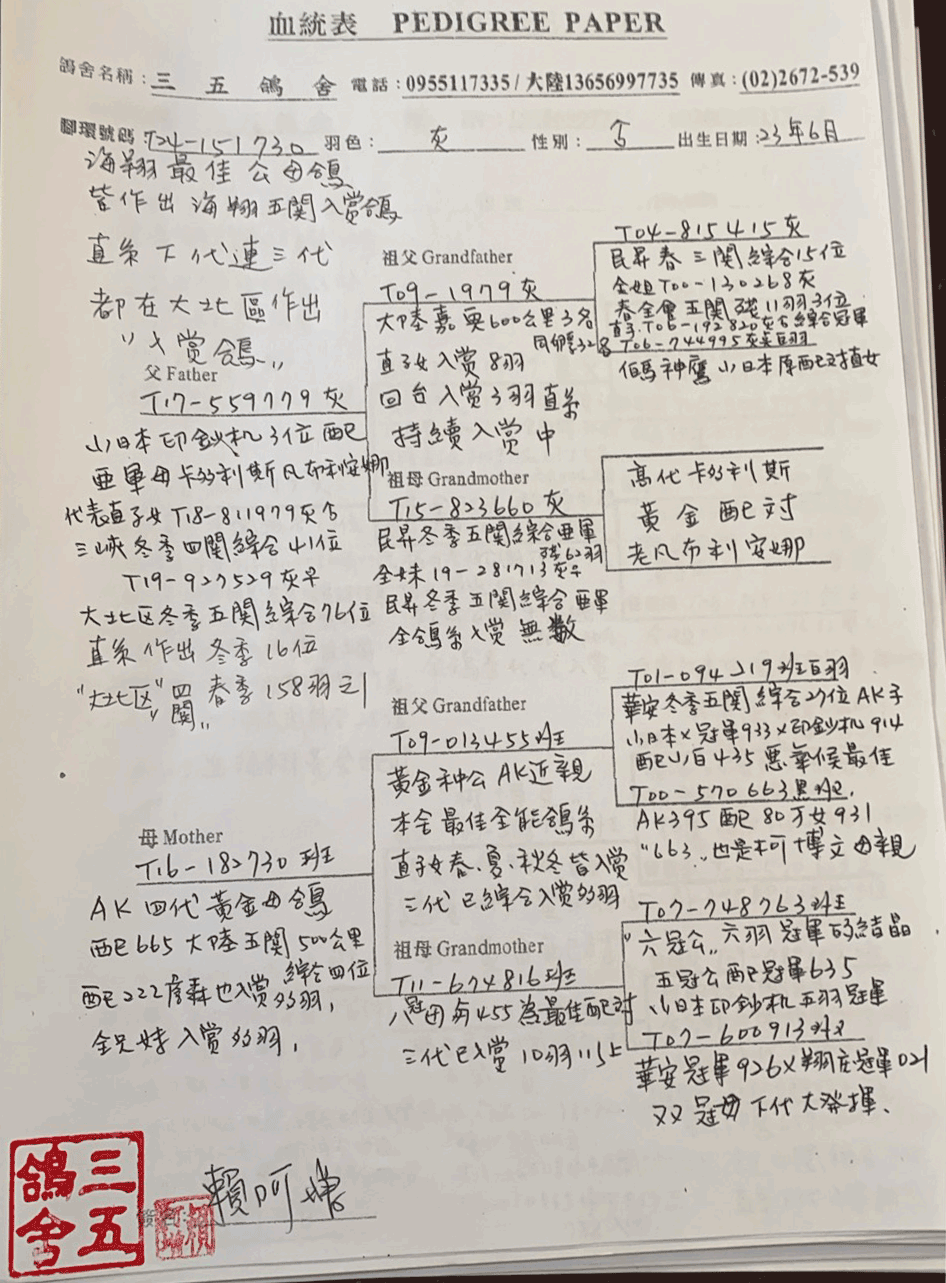 (3)"伯馬阿密魯" 633"T88-29633斑♂。本身入賞72年冬季五關綜合亞軍(全會殘3羽、獨佔2羽),其直子、女也入賞13羽之多,直系下代入賞綜合成績眾多,也都遺傳適應台灣獨特惡劣氣候的特性及本身的歸巢韌性及綜合性。