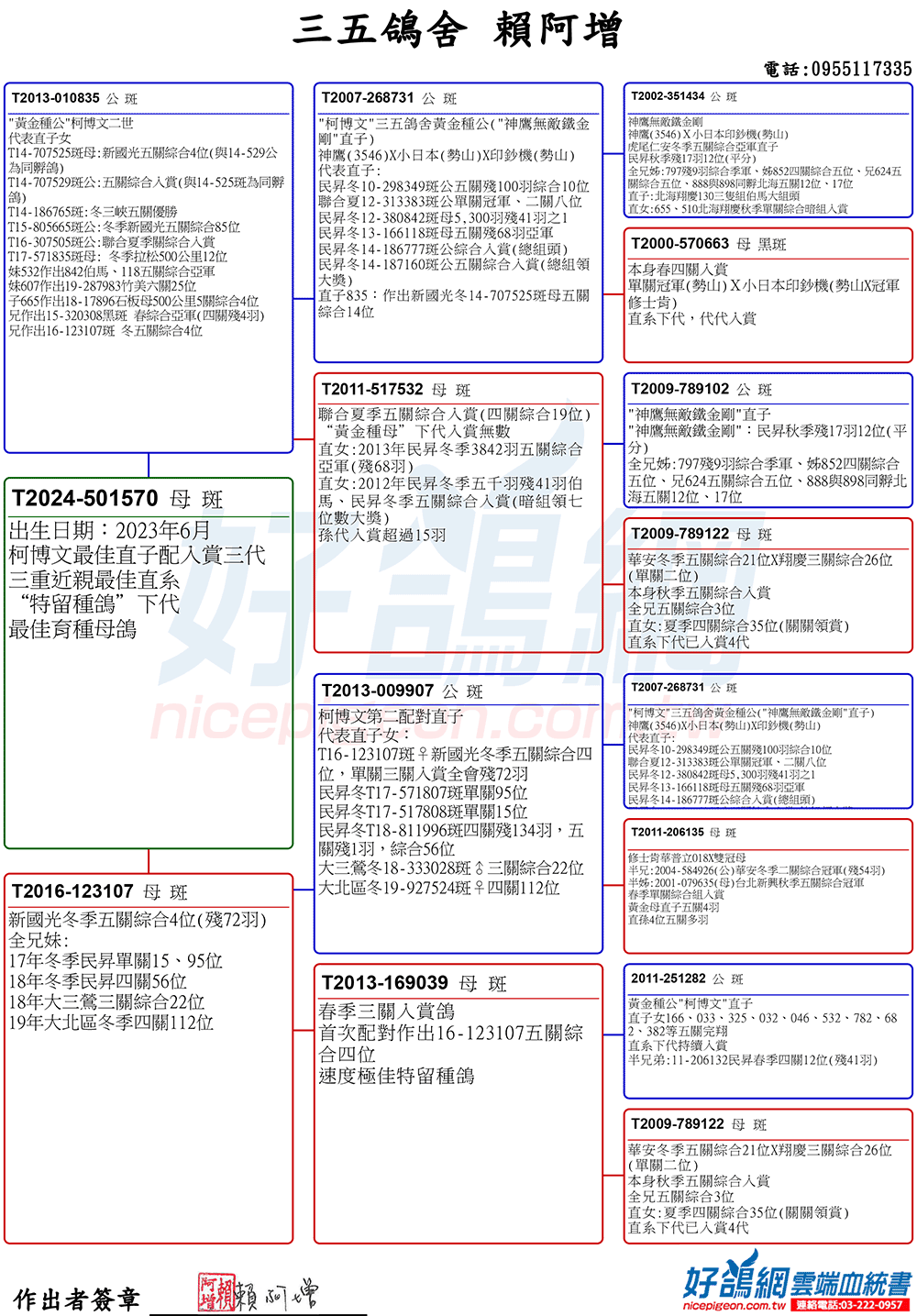 三五鴿舍賴阿增憑藉著已適應台灣氣候又易於融合的本土鴿系,以這四大支柱為基礎,四大鴿系彼此融合性強,兼具速度及適應惡劣氣候的特性,多年來不混入另外的鴿系以自己的紀錄鴿配紀錄鴿,實戰紀錄加上彼此融合的血系早已自成一格,三五鴿系才得以不斷創造佳績的。