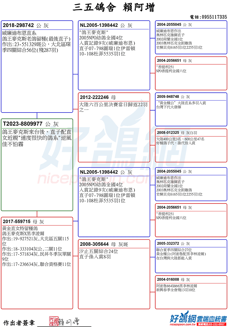 三五鴿舍賴阿增憑藉著已適應台灣氣候又易於融合的本土鴿系,以這四大支柱為基礎,四大鴿系彼此融合性強,兼具速度及適應惡劣氣候的特性,多年來不混入另外的鴿系以自己的紀錄鴿配紀錄鴿,實戰紀錄加上彼此融合的血系早已自成一格,三五鴿系才得以不斷創造佳績的。