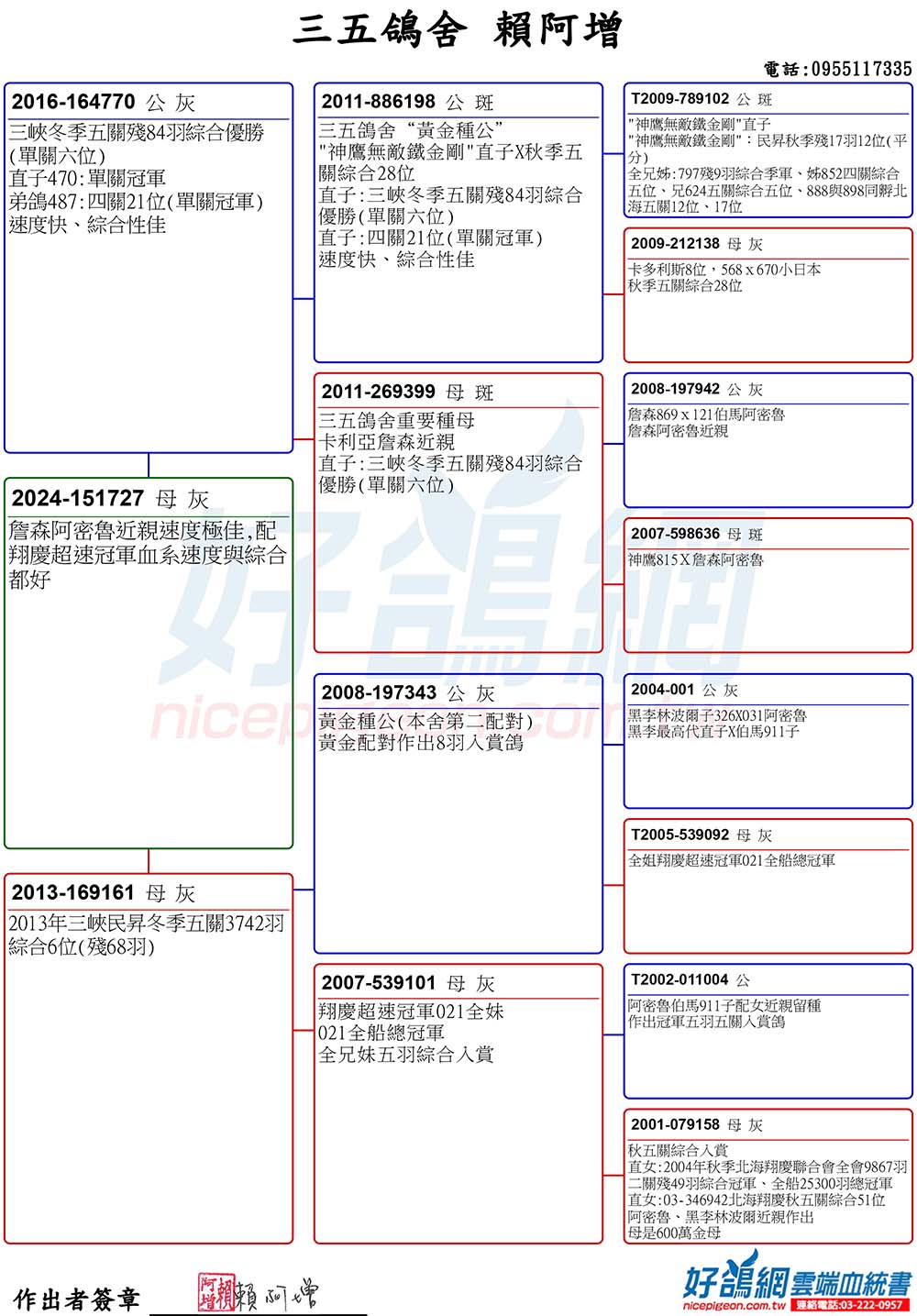 三五鴿舍賴阿增憑藉著已適應台灣氣候又易於融合的本土鴿系,以這四大支柱為基礎,四大鴿系彼此融合性強,兼具速度及適應惡劣氣候的特性,多年來不混入另外的鴿系以自己的紀錄鴿配紀錄鴿,實戰紀錄加上彼此融合的血系早已自成一格,三五鴿系才得以不斷創造佳績的。