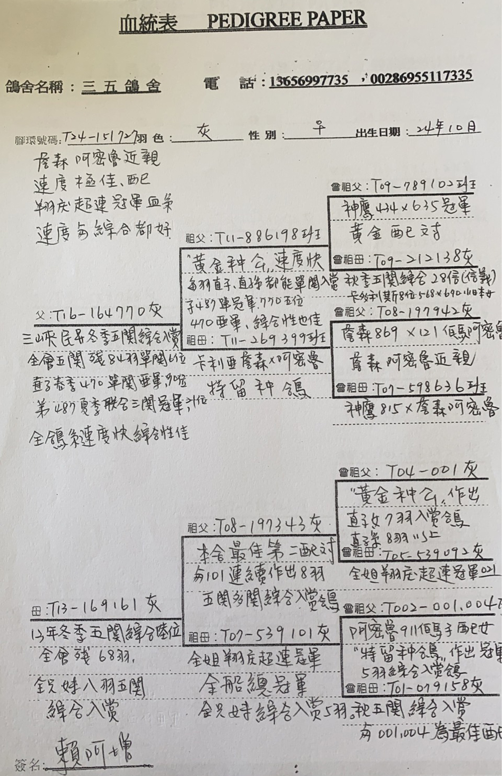 (4)91-02316灰白羽♂黑李3 1 6,其父鴿血統為林波爾,母鴿血統為老西翁系,這羽超級鴿是在1991年自強豪黑李處引進,下代翔續都有延續綜合性及快速歸巢之本能。