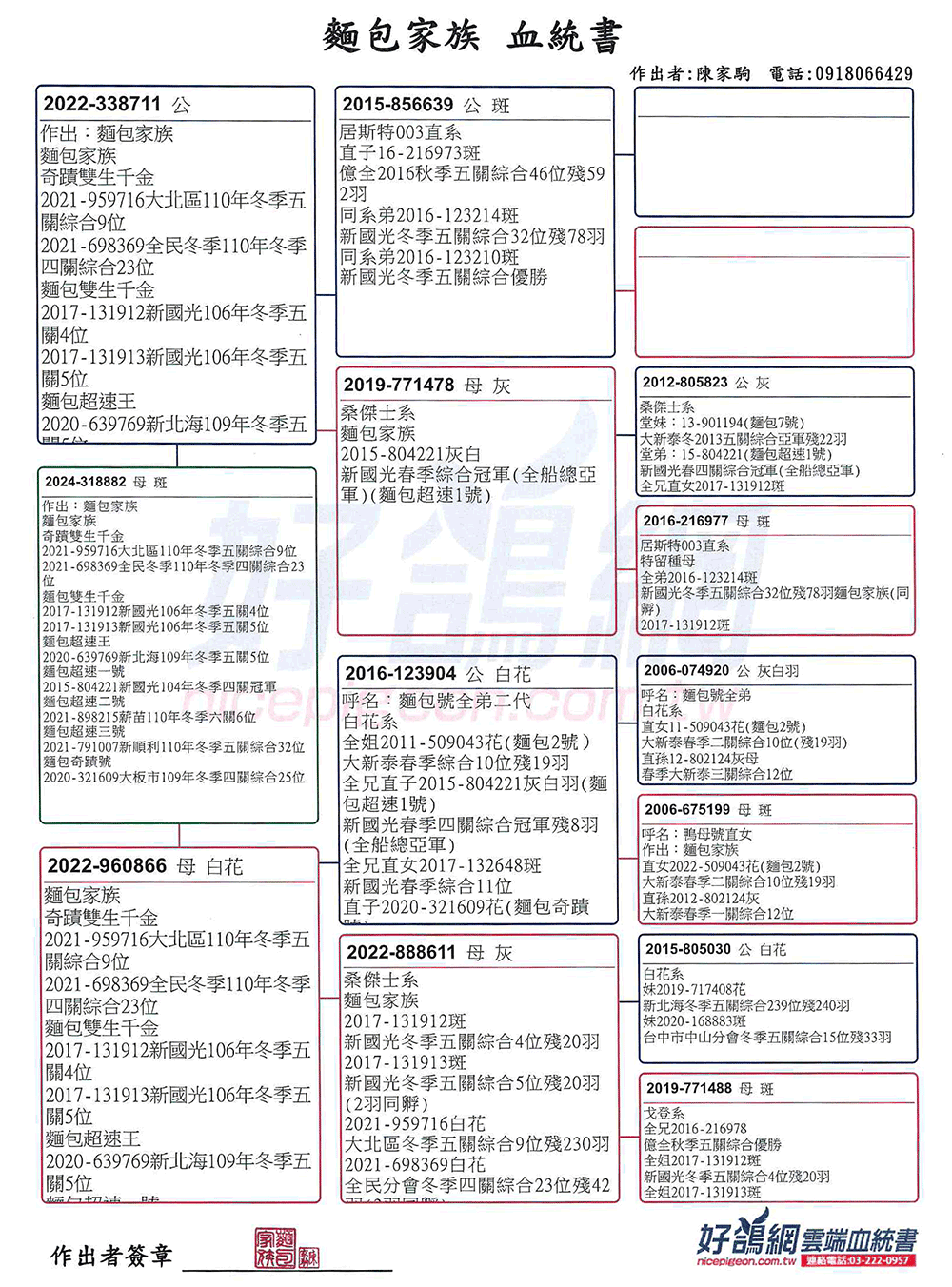 陳家駒表示,麵包家族在賽場上不論是綜合或是單關成績都能有亮眼表現,須歸功於原本優質的好鴿底與近親作育的方式。多年以來,透過旁系(叔、甥舅)互配近親作出為主,作出後選手鴿或是特留種鴿皆宜。我們可以從麵包家族的成績印證近親育方式是已經成為一套勝利方程式。所以才能在低歸返成數能名列前茅、在好天氣又能單關入賞的好表現!