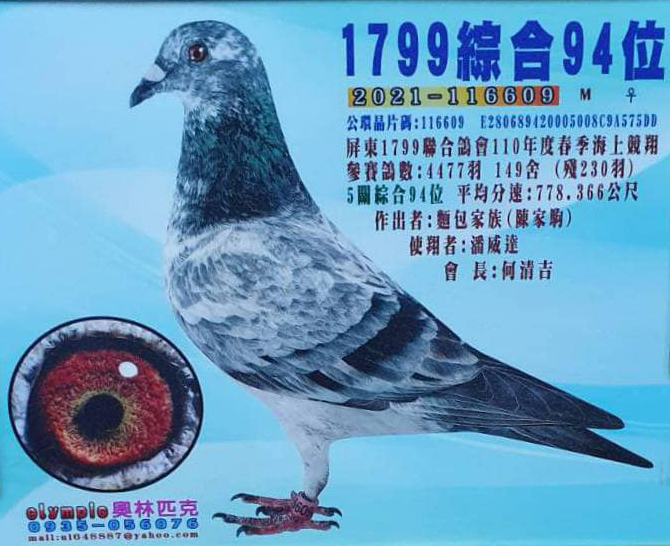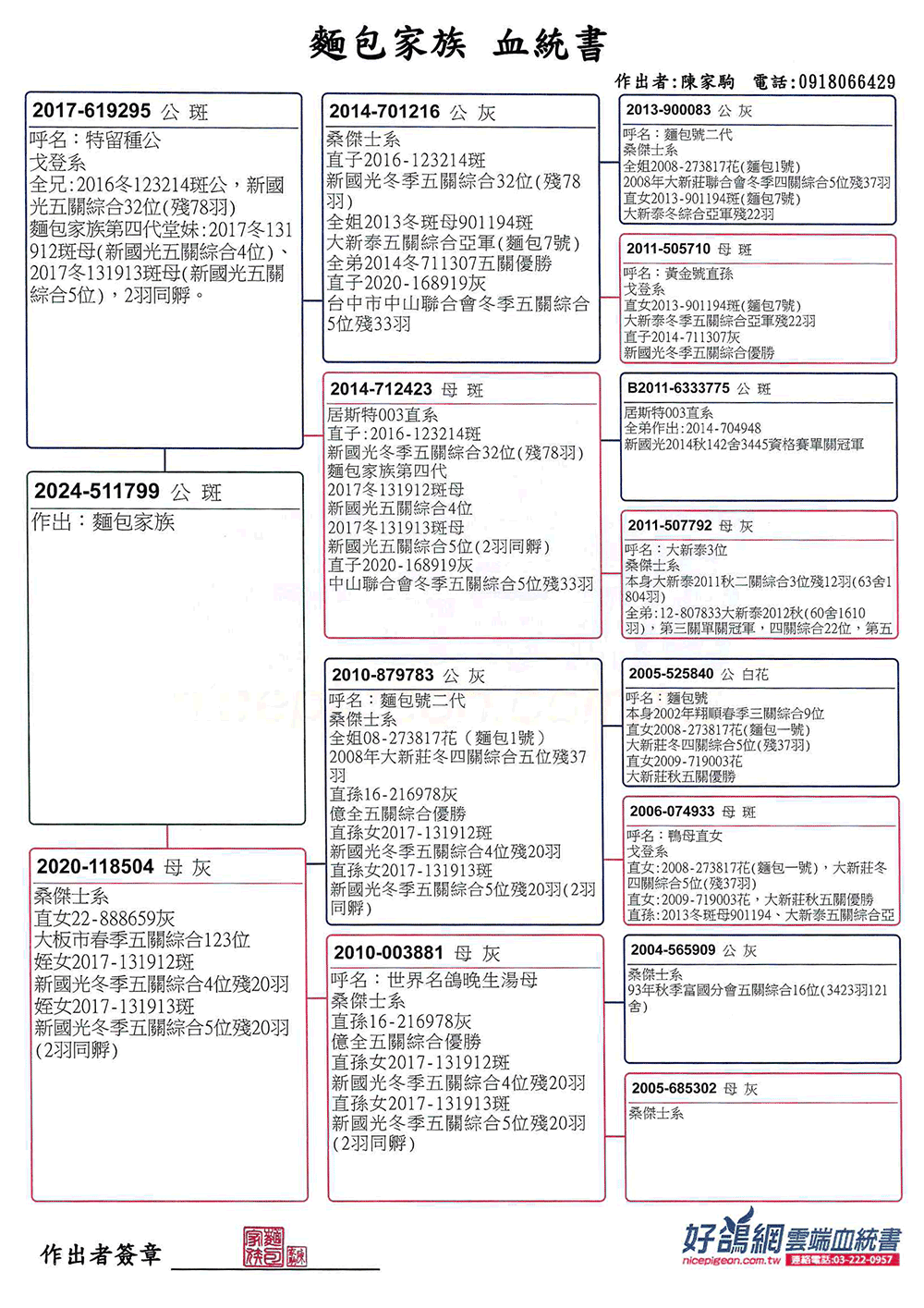 陳家駒表示,麵包家族在賽場上不論是綜合或是單關成績都能有亮眼表現,須歸功於原本優質的好鴿底與近親作育的方式。多年以來,透過旁系(叔、甥舅)互配近親作出為主,作出後選手鴿或是特留種鴿皆宜。我們可以從麵包家族的成績印證近親育方式是已經成為一套勝利方程式。所以才能在低歸返成數能名列前茅、在好天氣又能單關入賞的好表現!