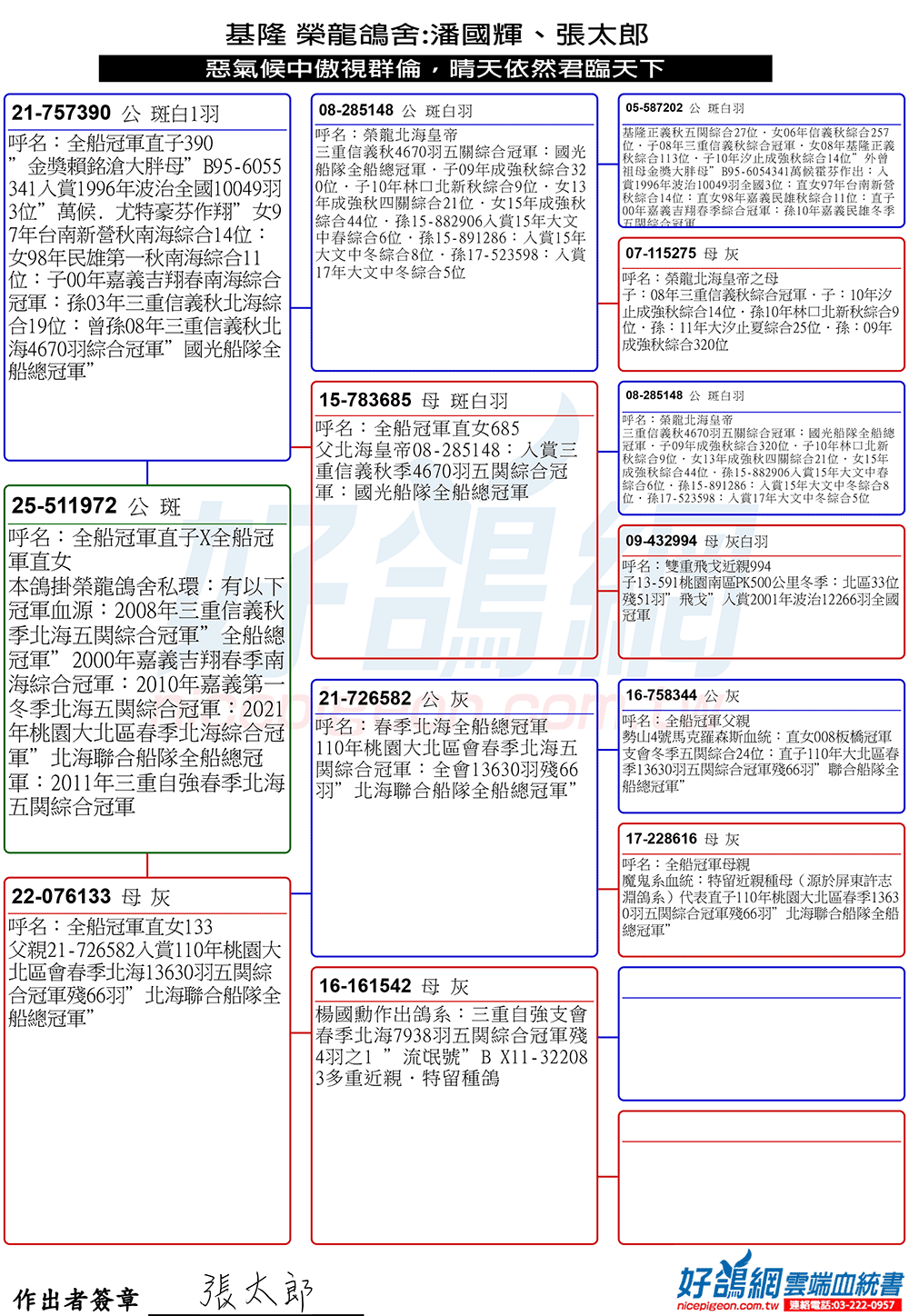 據了解,榮龍鴿舍現役育種主力,包括三重信義秋季五關綜合冠軍,國光船隊全船總冠軍,汐止成強秋季綜合冠軍,大新泰春季綜合冠軍之外,近期更是導入多羽戰功彪炳的實戰綜合冠軍直子女,包括大北區春季13630羽殘66羽五關綜合冠軍,北海船隊全船總冠軍直女,嘉義民雄第一支會冬季3115羽殘35羽五關綜合冠軍,全船總冠軍直女,雙北聯盟夏季3456羽殘3羽伯馬四關綜合冠軍,大草屯冬季11317羽殘30羽五關綜合冠軍直子女,竹南大新冬季2677羽殘3羽伯馬六關綜合冠軍直女,南臺灣夏季七關綜合冠軍直女,彰化大埔塩冬季6338羽殘30羽五關綜合冠軍直女。