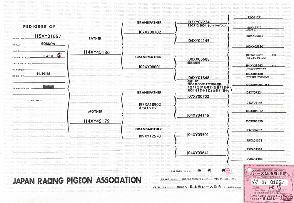 詹森的大名鴿019,B73-6736019,雄鴿。「019」是詹森兄弟自有史以來最為傑出的賽鴿,光是冠軍的記錄就高達18次之多,有的傳聞甚至是更多!