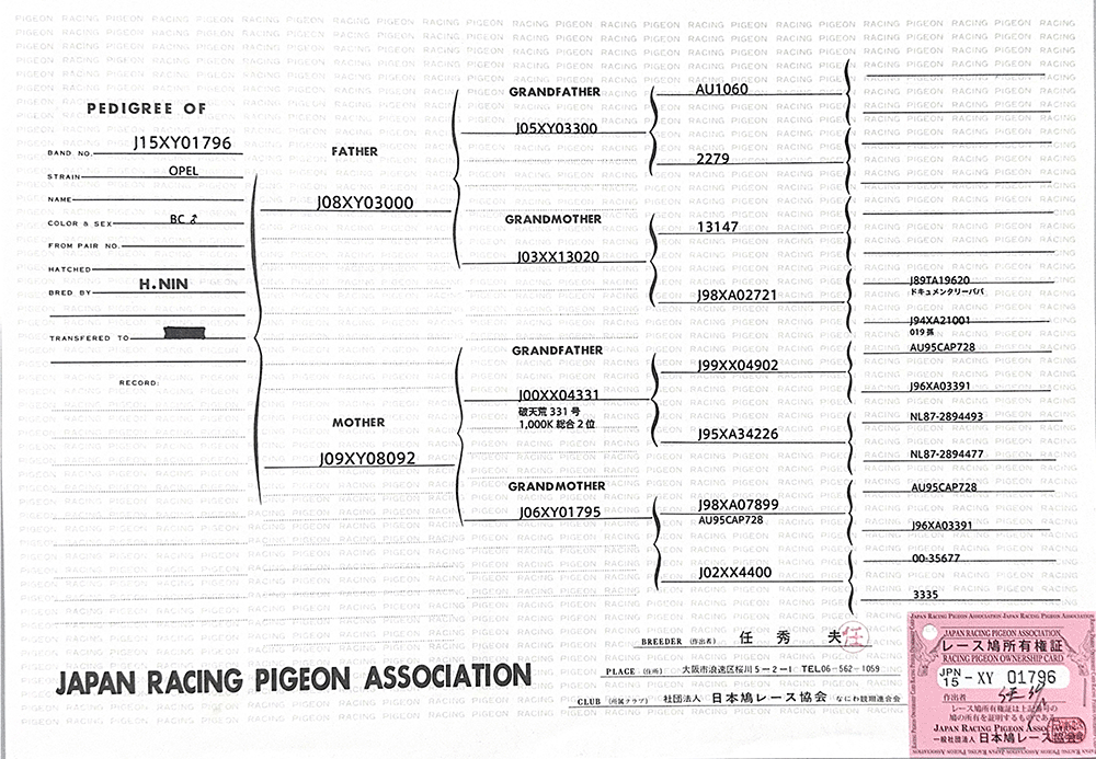 詹森的大名鴿019,B73-6736019,雄鴿。「019」是詹森兄弟自有史以來最為傑出的賽鴿,光是冠軍的記錄就高達18次之多,有的傳聞甚至是更多!