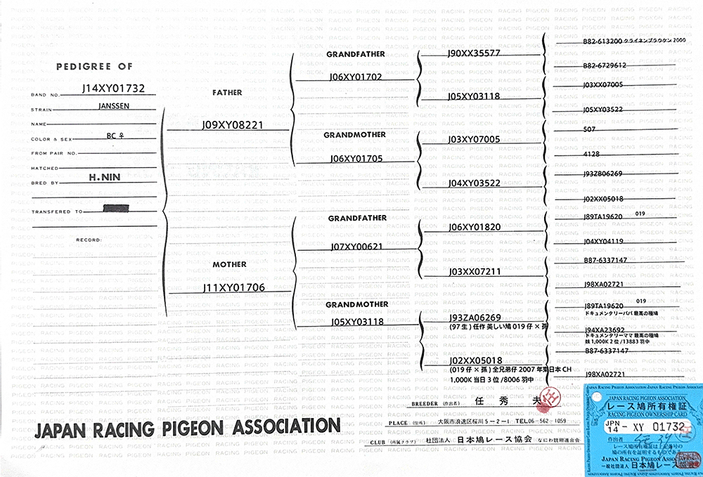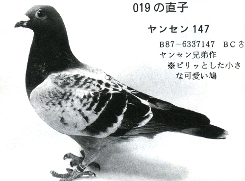 詹森的大名鴿019,B73-6736019,雄鴿。「019」是詹森兄弟自有史以來最為傑出的賽鴿,光是冠軍的記錄就高達18次之多,有的傳聞甚至是更多!