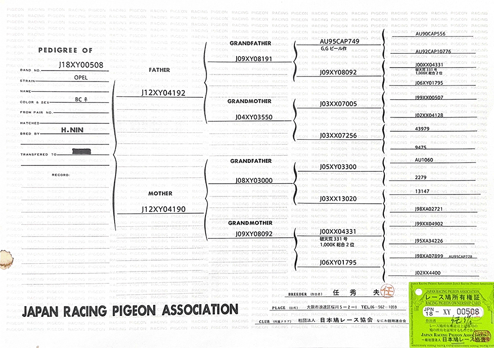 詹森的大名鴿019,B73-6736019,雄鴿。「019」是詹森兄弟自有史以來最為傑出的賽鴿,光是冠軍的記錄就高達18次之多,有的傳聞甚至是更多!
