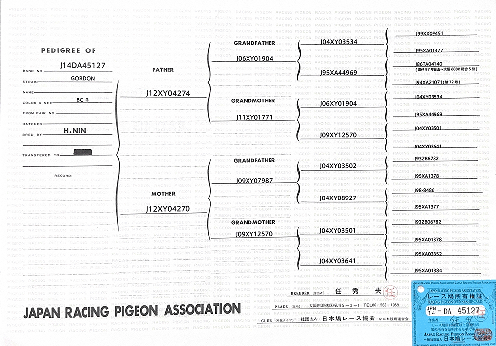 詹森的大名鴿019,B73-6736019,雄鴿。「019」是詹森兄弟自有史以來最為傑出的賽鴿,光是冠軍的記錄就高達18次之多,有的傳聞甚至是更多!