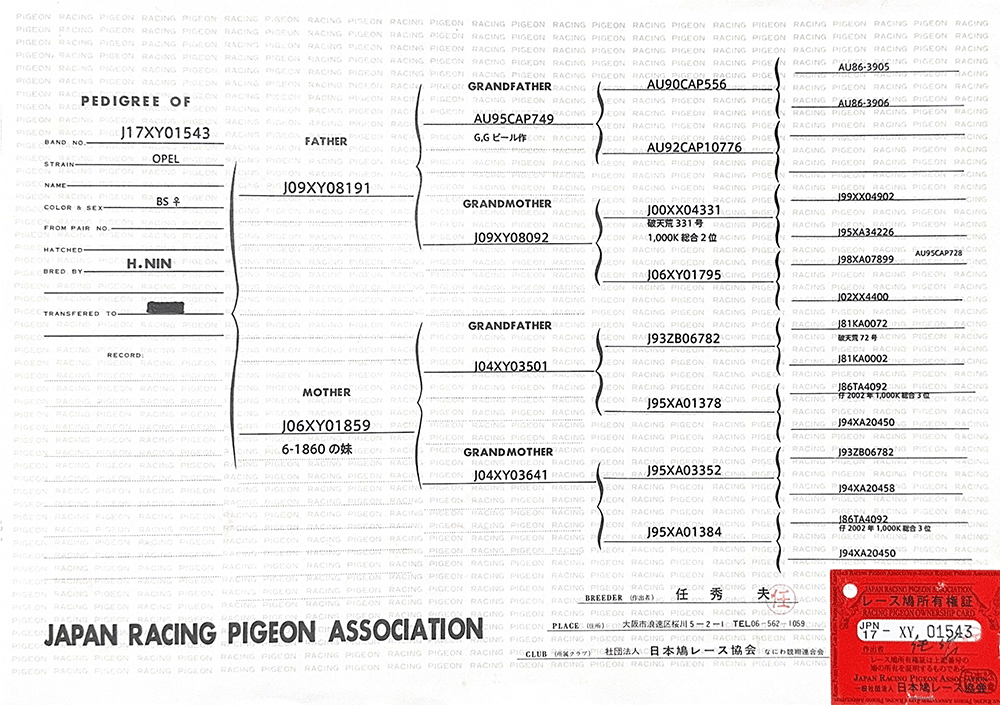 詹森的大名鴿019,B73-6736019,雄鴿。「019」是詹森兄弟自有史以來最為傑出的賽鴿,光是冠軍的記錄就高達18次之多,有的傳聞甚至是更多!