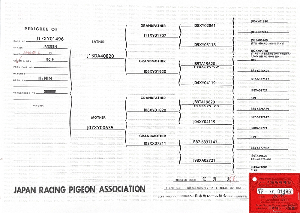 任秀夫菁英種鴿;詹森019多重近親作出