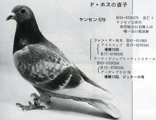 詹森的大名鴿019,B73-6736019,雄鴿。「019」是詹森兄弟自有史以來最為傑出的賽鴿,光是冠軍的記錄就高達18次之多,有的傳聞甚至是更多!