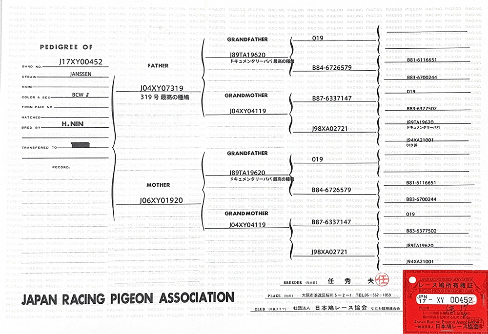 ▲父鴿:J2004-XY07319詹森019直孫319