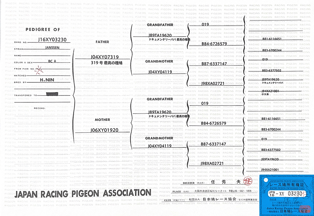 詹森的大名鴿019,B73-6736019,雄鴿。「019」是詹森兄弟自有史以來最為傑出的賽鴿,光是冠軍的記錄就高達18次之多,有的傳聞甚至是更多!