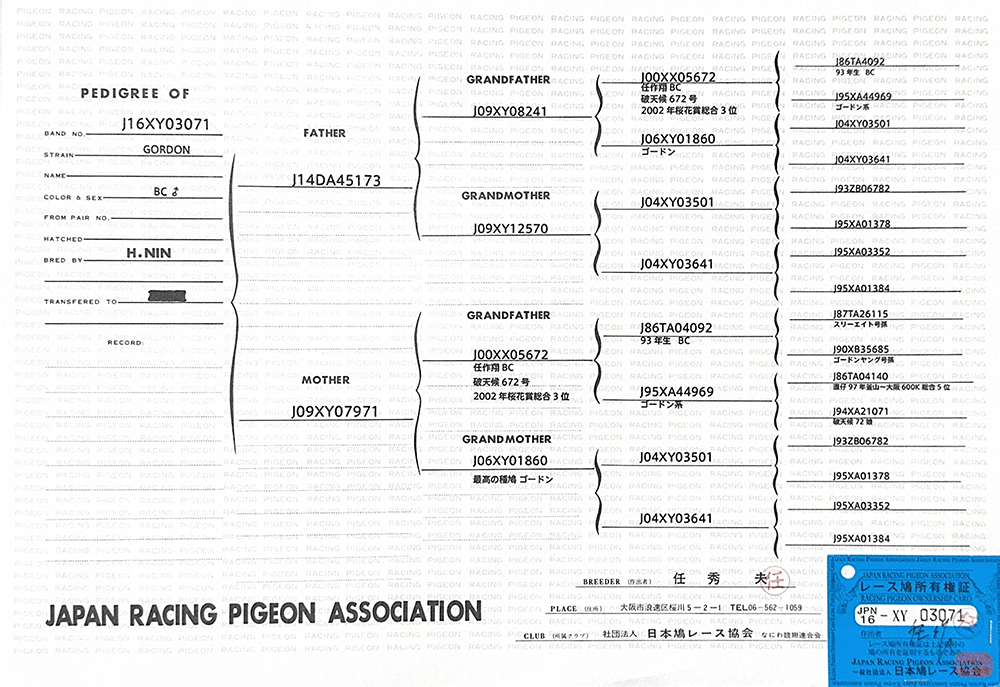 詹森的大名鴿019,B73-6736019,雄鴿。「019」是詹森兄弟自有史以來最為傑出的賽鴿,光是冠軍的記錄就高達18次之多,有的傳聞甚至是更多!