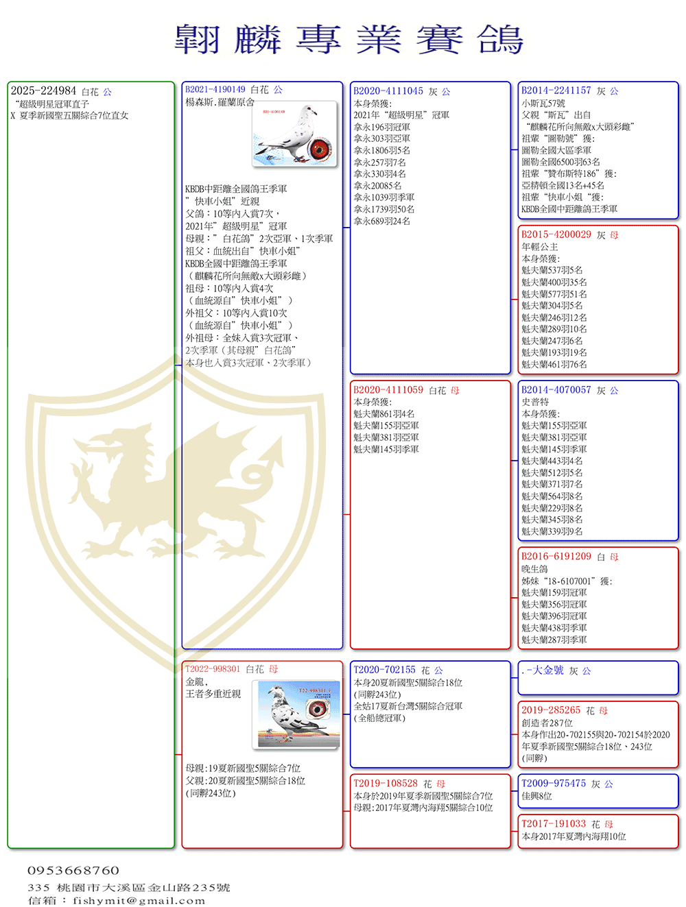 2025年秋季寄翔7羽於三重永迋兩關排名8位、三關綜合優勝、暗組多項獲大奬(全會3776羽殘存57羽)。第四關全會時間內無鴿歸返的情況下,在永迋與另一友人合作作育的一羽白花母鴿25-551799是時間過後全會第一隻歸返感應鴿鐘後成績有上傳網路的(全船各會當日歸返極為少數)。