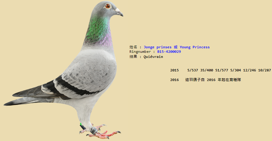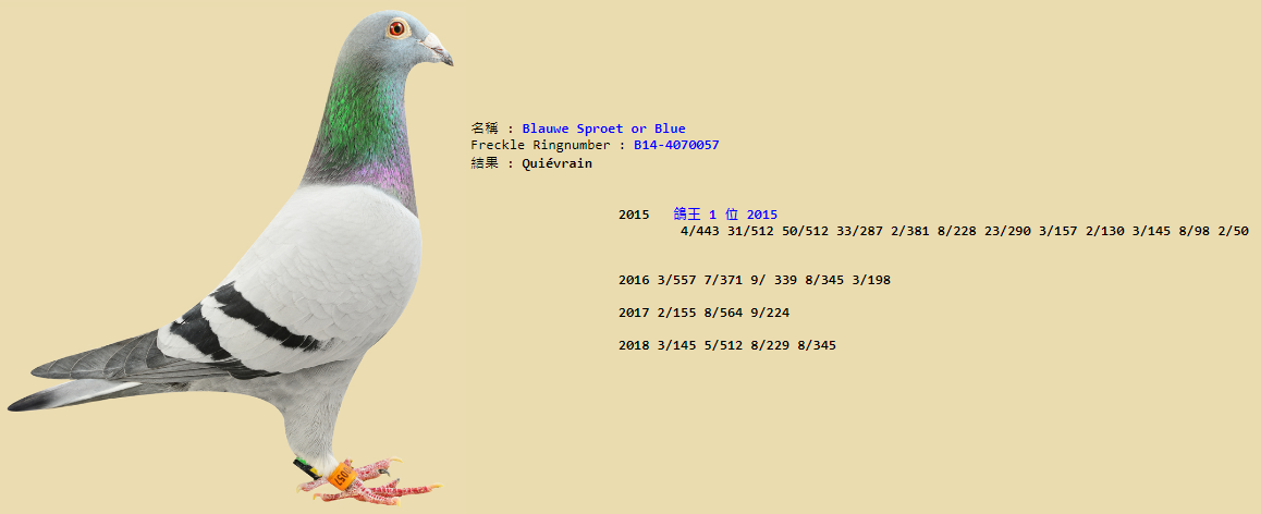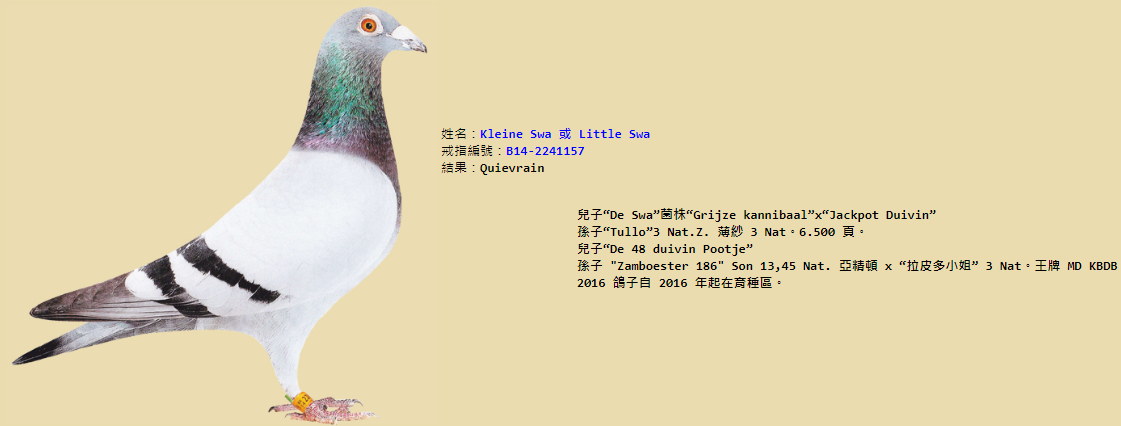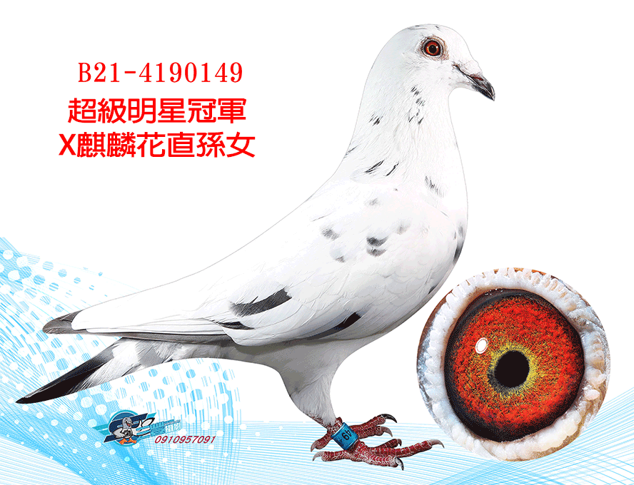 姐鴿:2017年冬季竹南大新5856羽六關綜合54位(殘64羽);傳奇凱旋973孫X鴿王費德爾孫女