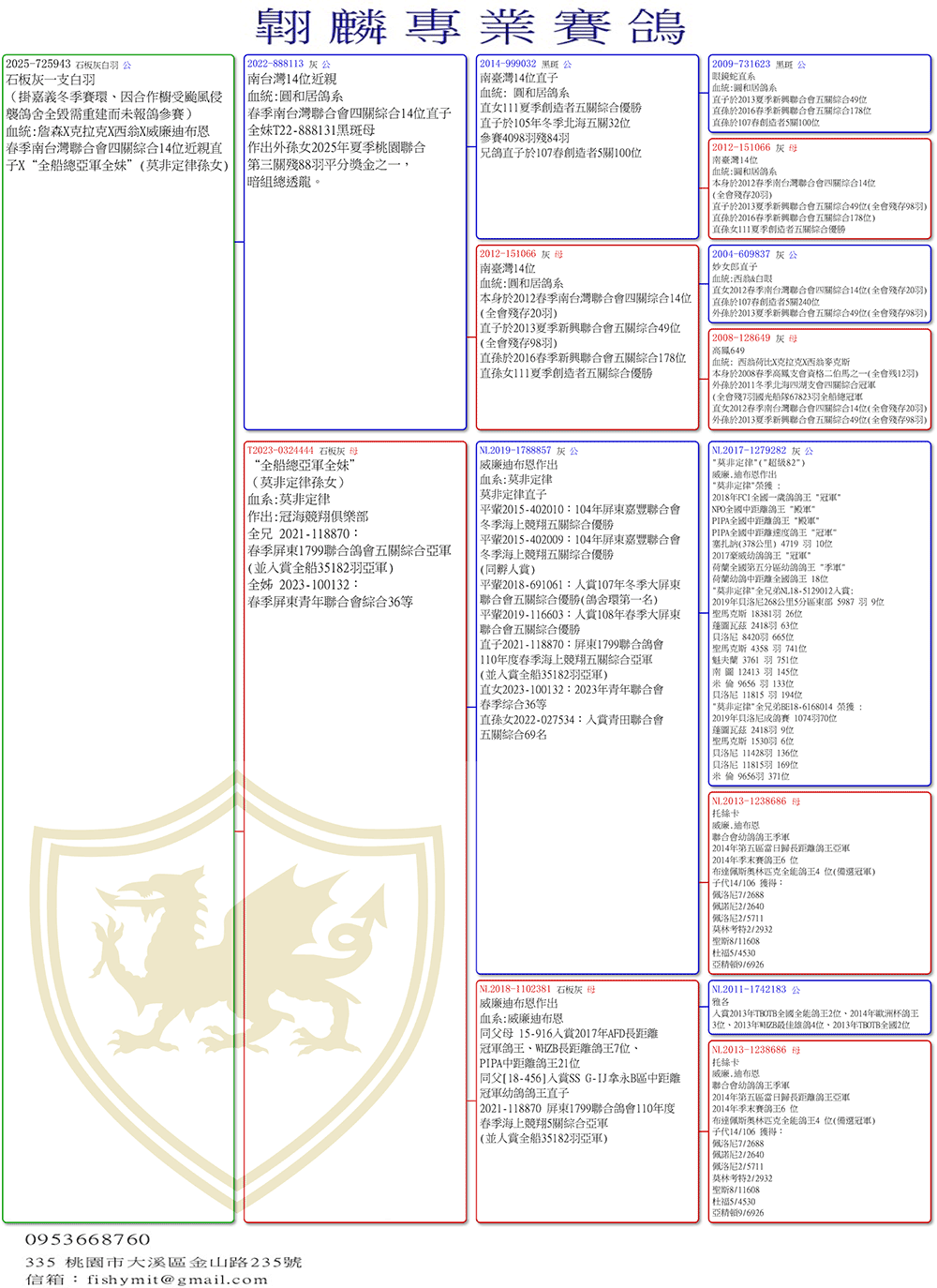 2025年秋季寄翔7羽於三重永迋兩關排名8位、三關綜合優勝、暗組多項獲大奬(全會3776羽殘存57羽)。第四關全會時間內無鴿歸返的情況下,在永迋與另一友人合作作育的一羽白花母鴿25-551799是時間過後全會第一隻歸返感應鴿鐘後成績有上傳網路的(全船各會當日歸返極為少數)。