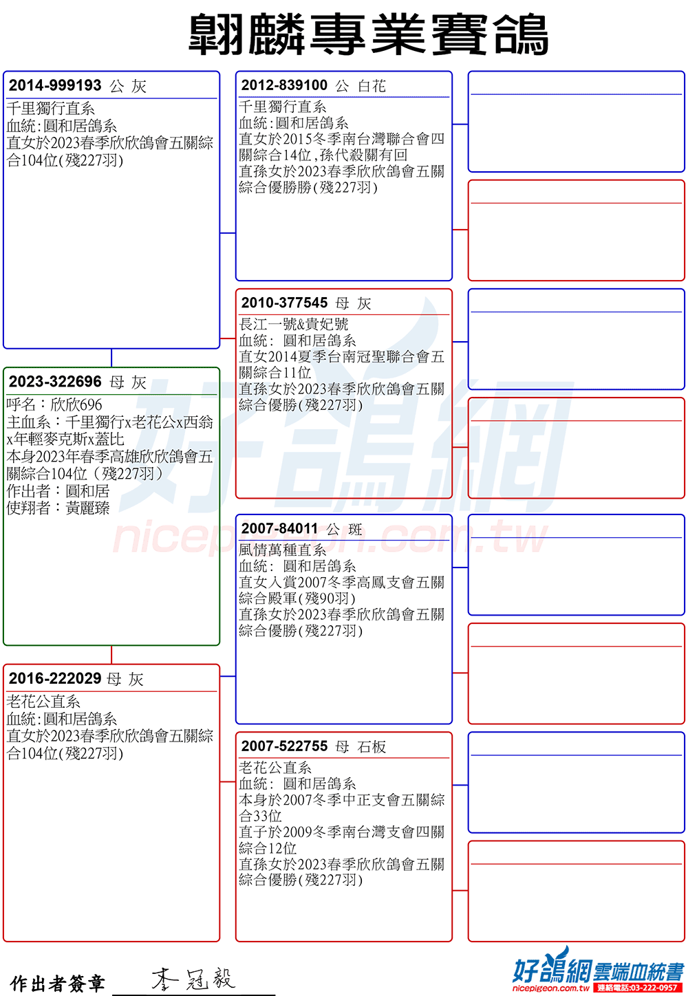 特別值得一提的是從2019年冬季首次寄翔8羽參賽新北市三重新順利分會即入賞五關綜合27位與48位,同年秋季寄翔3羽又入賞綜合61位,撲克組2 K 5位暗組多項獲獎。