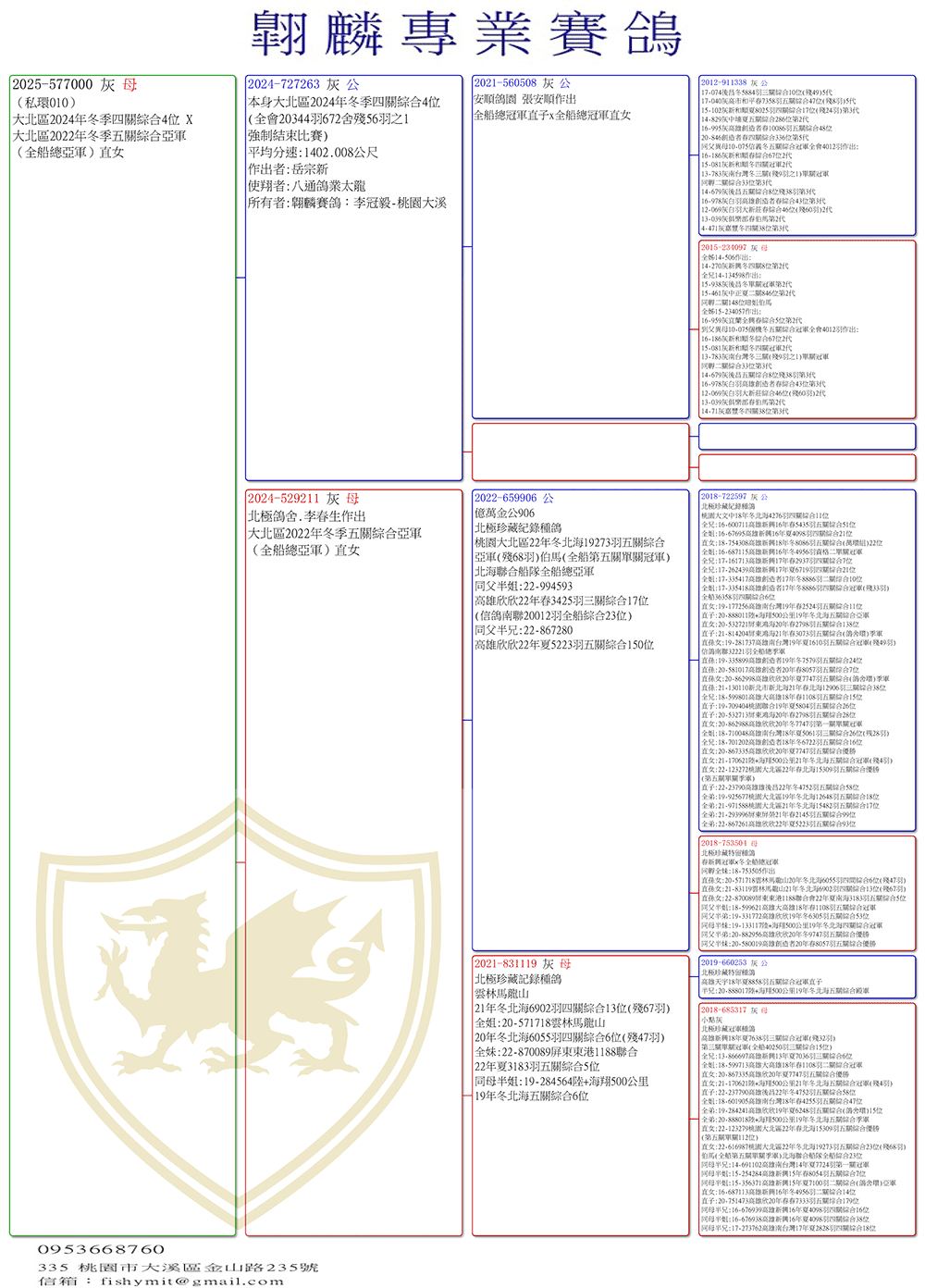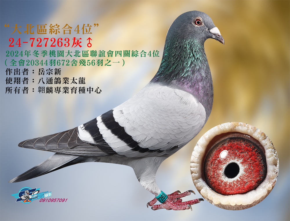父:2024-727263灰,本身大北區2024年冬季四關綜合4位、全會2萬餘隻殘56羽之1強制結束比賽。