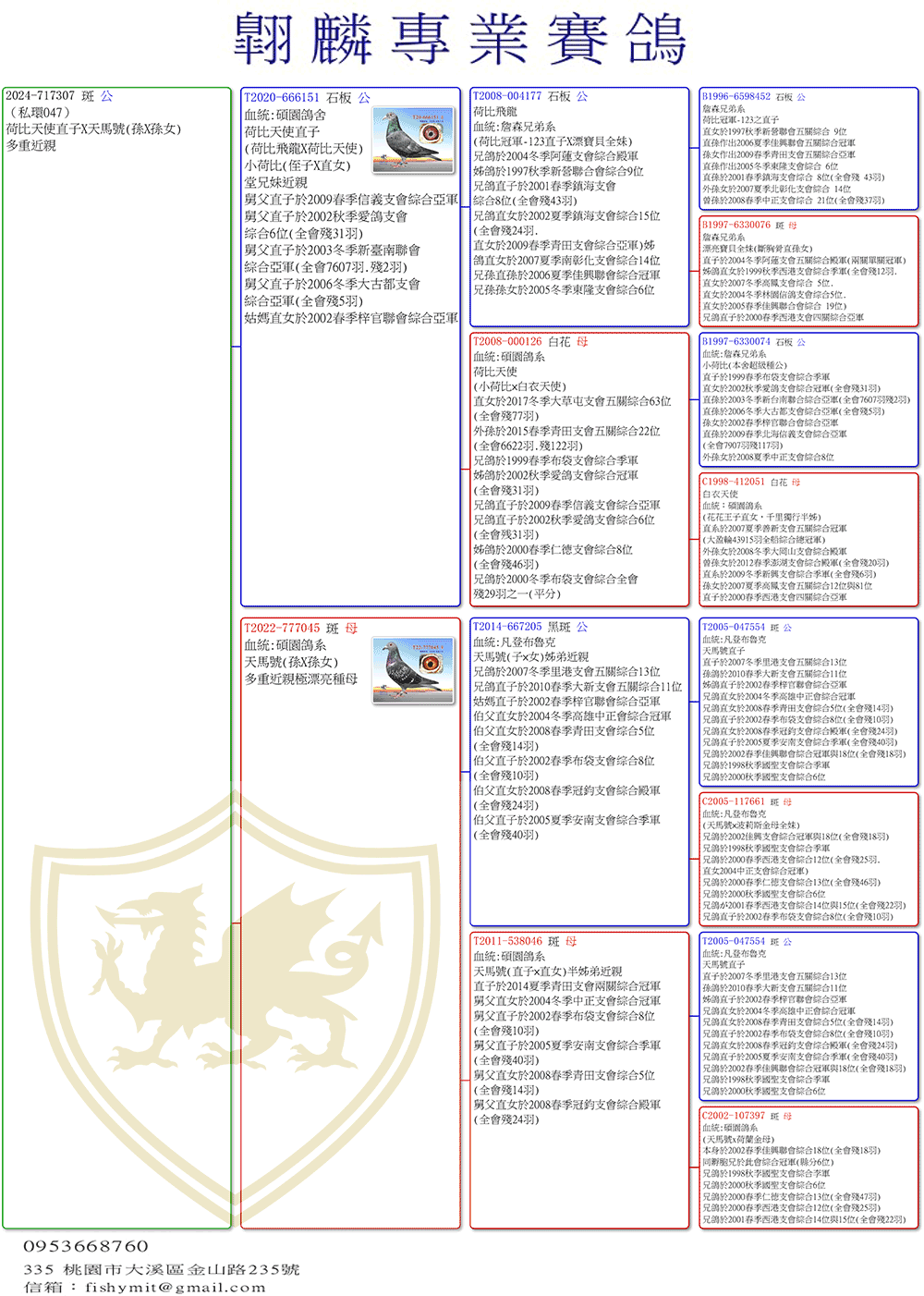 2023年秋季寄翔6羽於三重永迋入賞三關綜合6位、28位、優勝,暗組總透龍獲全會最高奬賞。