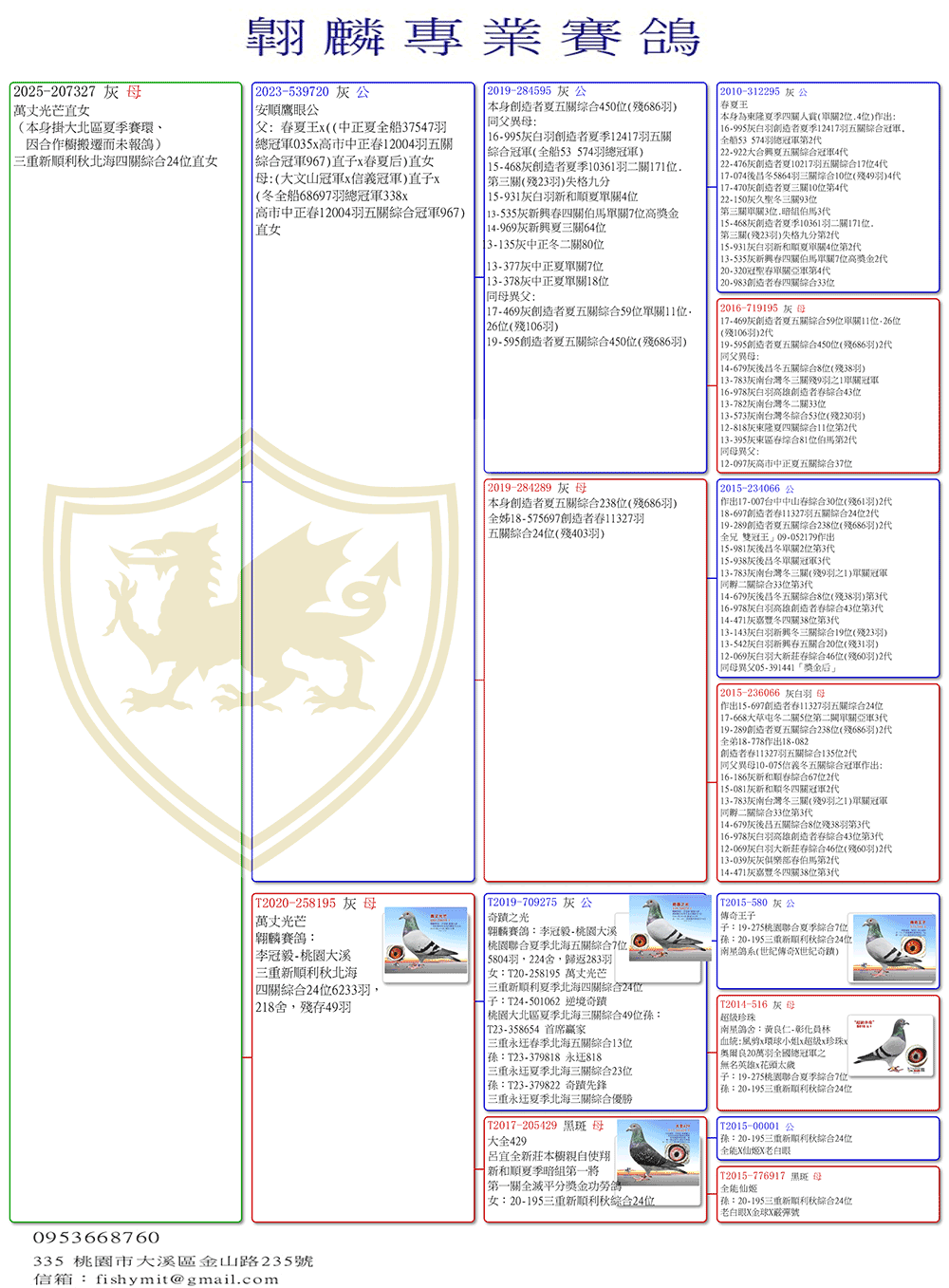 2025年秋季寄翔7羽於三重永迋兩關排名8位、三關綜合優勝、暗組多項獲大奬(全會3776羽殘存57羽)。第四關全會時間內無鴿歸返的情況下,在永迋與另一友人合作作育的一羽白花母鴿25-551799是時間過後全會第一隻歸返感應鴿鐘後成績有上傳網路的(全船各會當日歸返極為少數)。