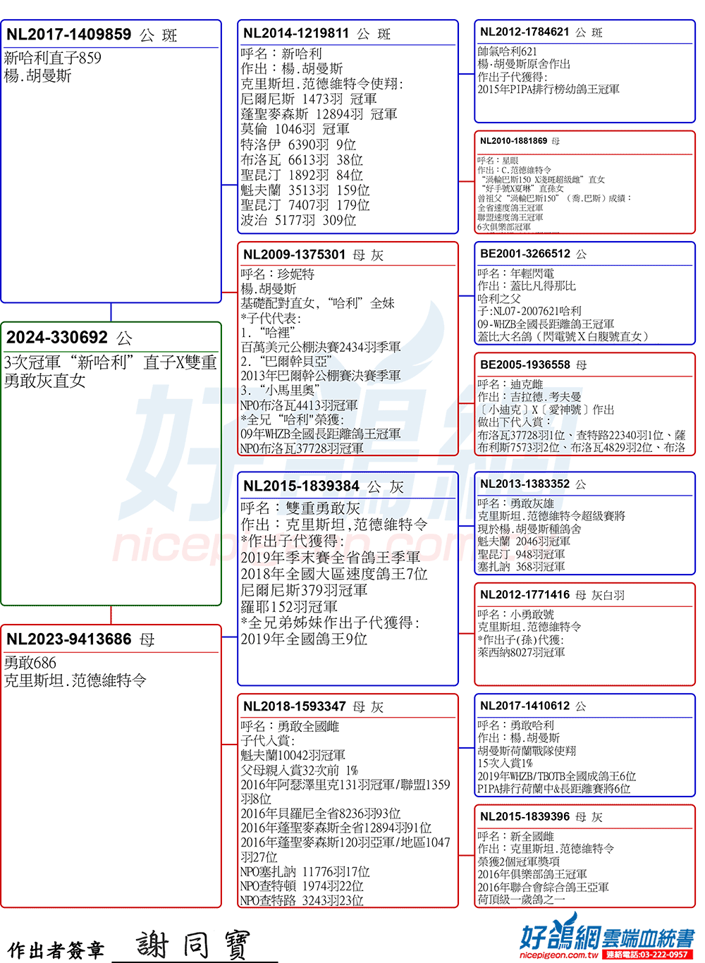 「哈利」,環號NL07-2007621,荷蘭名家楊•胡曼斯的超級賽鴿,荷蘭賽鴿史上最優秀的神奇賽將!「哈利」掀起的風潮可以說是當代鴿壇最優秀的超級鴿之一。