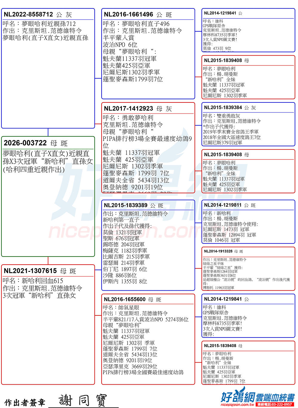 「哈利」,環號NL07-2007621,荷蘭名家楊•胡曼斯的超級賽鴿,荷蘭賽鴿史上最優秀的神奇賽將!「哈利」掀起的風潮可以說是當代鴿壇最優秀的超級鴿之一。