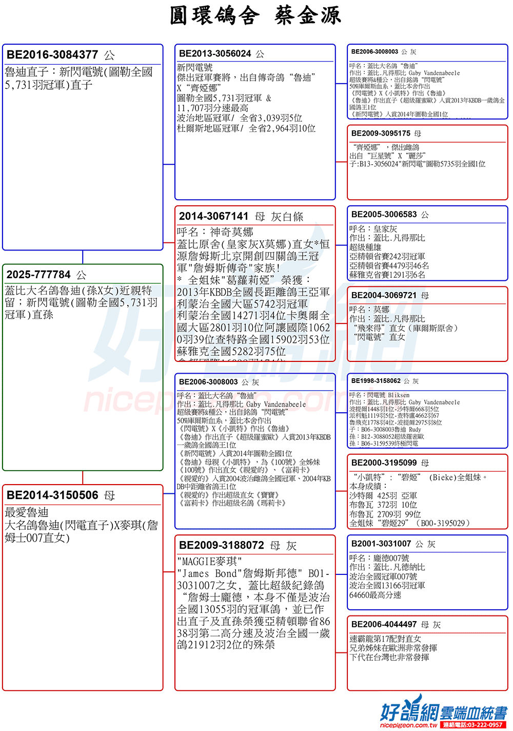蓋比大名鴿魯迪(孫X女)近親特留;新閃電號(圖勒全國5,731羽冠軍)直孫