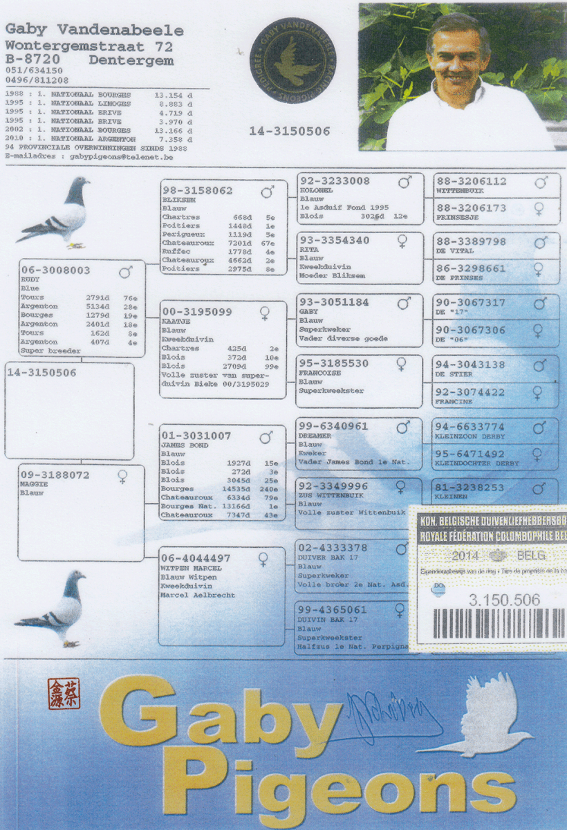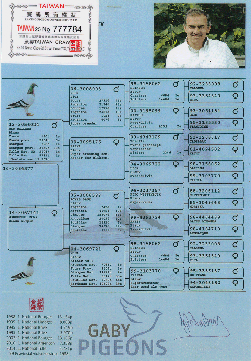 以蓋比血統家族聞名的蔡金源分享,蓋比鴿系的骨架堅硬、健康狀況、種鴿融合度都很好,很適合激烈的台灣海翔。近年如22-254484(灰)冠聖冬季3223羽五關綜合冠軍(全船15位),冠軍鴿之母就是由蔡董作出,血統為超級羅密歐4號(羅密歐直子)X漂亮小姐(魯迪直女)。這羽優秀的蓋比血統冠軍鴿在第一關單關亞軍、第二關單關季軍、第三關單關冠軍、第四關單關季軍,可以說是大殺四方、名不虛傳。可見,蔡金源的蓋比家族經過實戰驗證,無論是近親或是交配他系,都能夠入賞得獎屢創佳績。