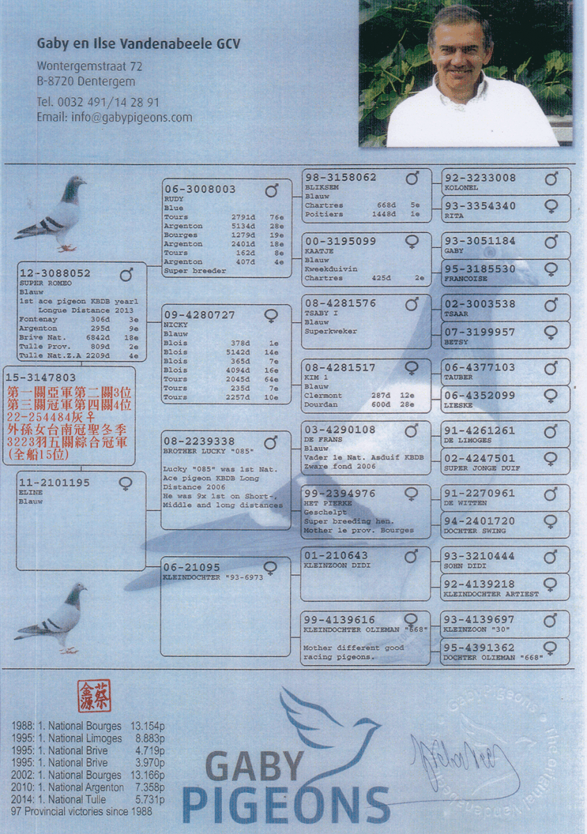 以蓋比血統家族聞名的蔡金源分享,蓋比鴿系的骨架堅硬、健康狀況、種鴿融合度都很好,很適合激烈的台灣海翔。近年如22-254484(灰)冠聖冬季3223羽五關綜合冠軍(全船15位),冠軍鴿之母就是由蔡董作出,血統為超級羅密歐4號(羅密歐直子)X漂亮小姐(魯迪直女)。這羽優秀的蓋比血統冠軍鴿在第一關單關亞軍、第二關單關季軍、第三關單關冠軍、第四關單關季軍,可以說是大殺四方、名不虛傳。可見,蔡金源的蓋比家族經過實戰驗證,無論是近親或是交配他系,都能夠入賞得獎屢創佳績。