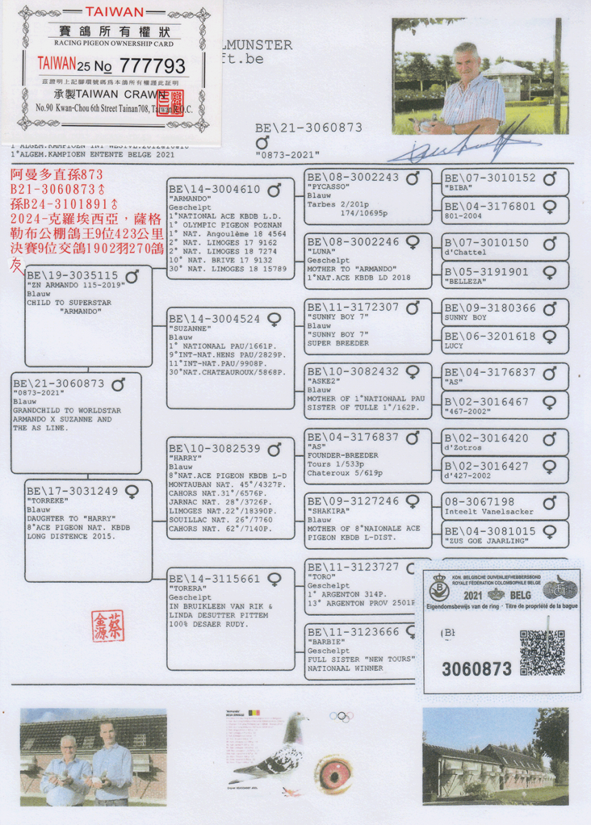 22年台南冠聖冬季3223羽五關綜合冠軍(全船15位)第一關亞軍、第二關三位、第三關冠軍、第四關四位家族;阿曼多直孫X魯迪直孫女