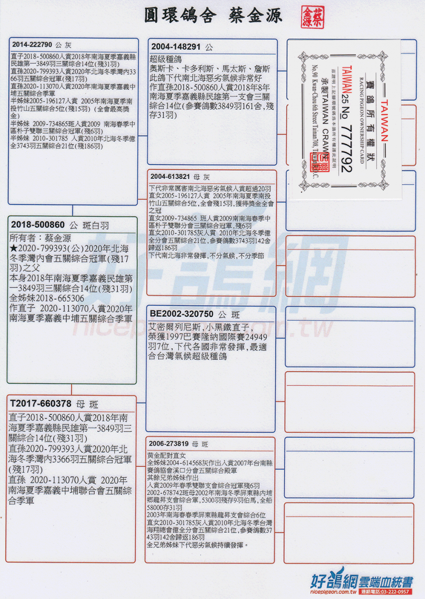 ▲父鴿:2018-500860夏季嘉義民雄第一支會3849羽三關綜合14位