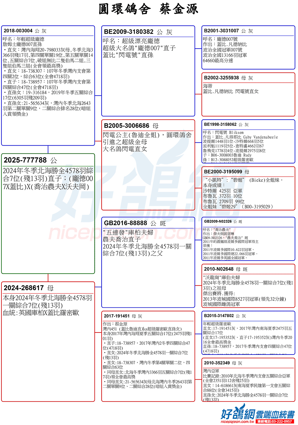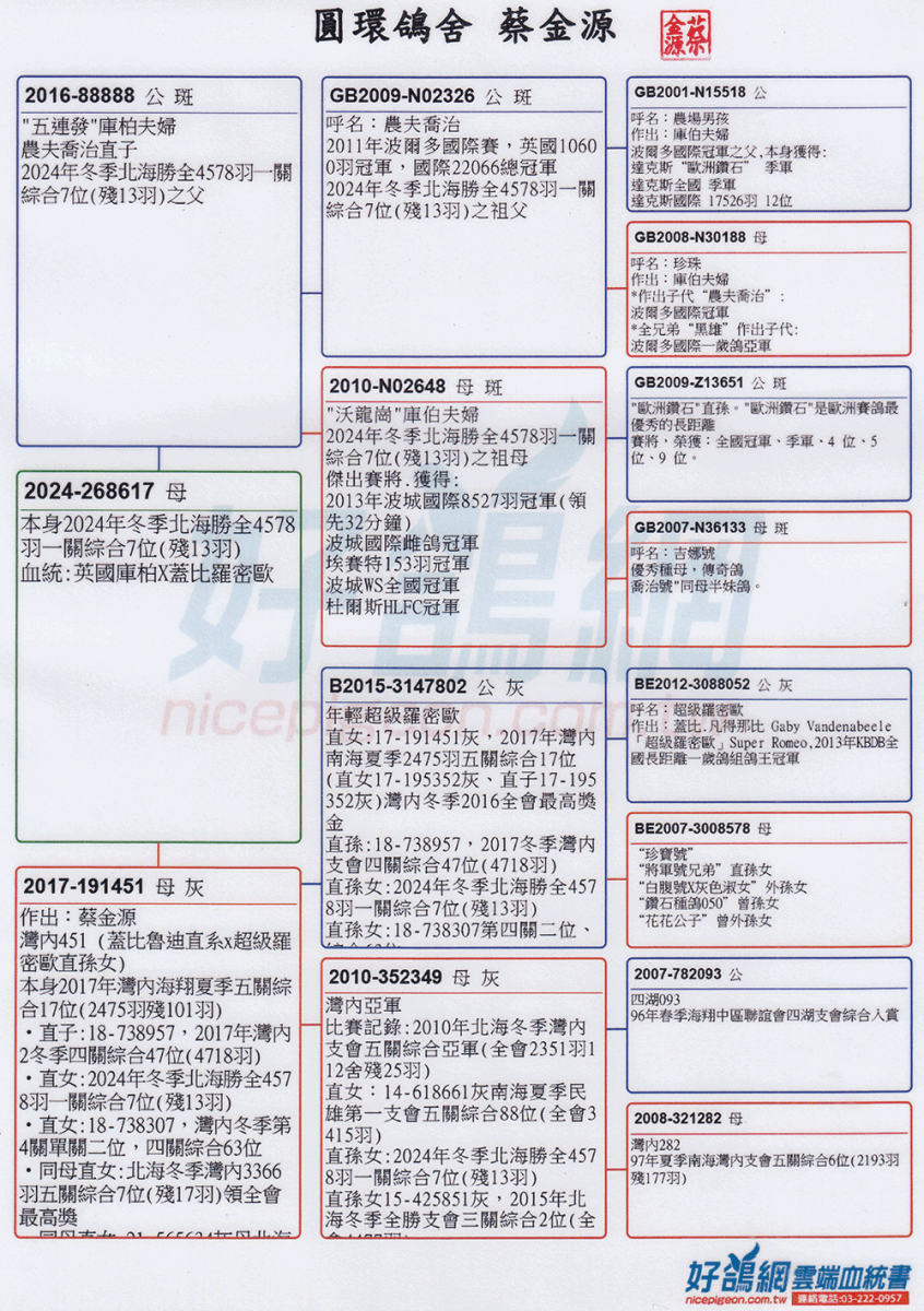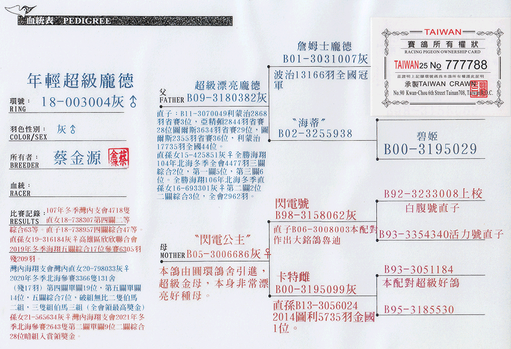 ▲曾曾祖母:B2000-3195029”碧姬”波提爾全省2766羽亞軍,查特魯全省4498羽7位