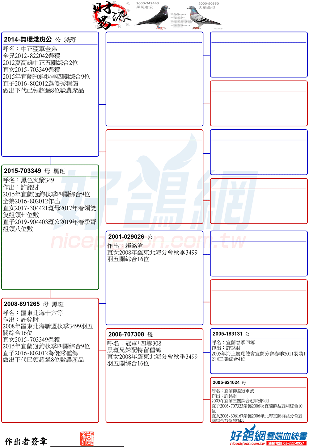 2025年夏季宜蘭聯合會二關綜合8位,環號25-137047灰♂,其父鴿24-993616斑♂,本身入賞夏季三關綜合7位(群益冠軍家族X小火箭三冠家族),母親24-333022,血統為夏季三關綜合亞軍全妹(雙伯馬家族X哈利近親)所作出,許銘財又一次以實戰成績印證了優質血統一脈相承的可貴。