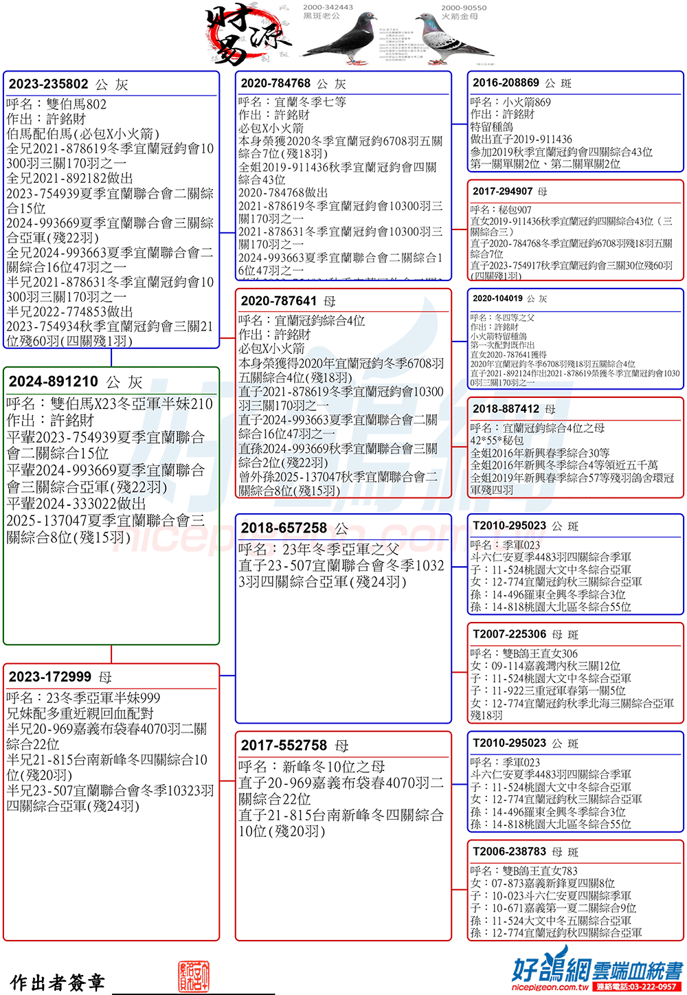 2025年夏季宜蘭聯合會二關綜合8位,環號25-137047灰♂,其父鴿24-993616斑♂,本身入賞夏季三關綜合7位(群益冠軍家族X小火箭三冠家族),母親24-333022,血統為夏季三關綜合亞軍全妹(雙伯馬家族X哈利近親)所作出,許銘財又一次以實戰成績印證了優質血統一脈相承的可貴。