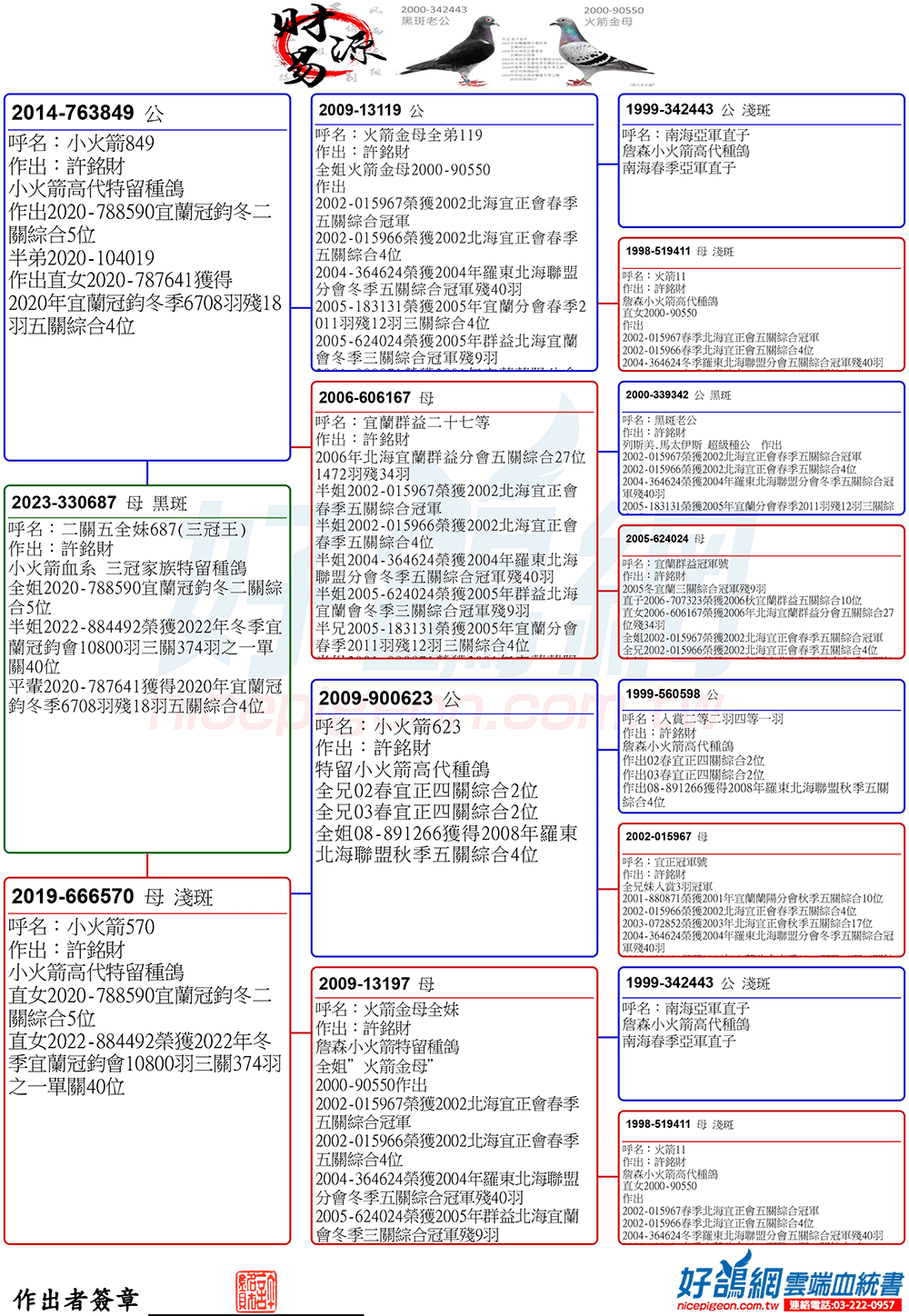 2025年夏季宜蘭聯合會二關綜合8位,環號25-137047灰♂,其父鴿24-993616斑♂,本身入賞夏季三關綜合7位(群益冠軍家族X小火箭三冠家族),母親24-333022,血統為夏季三關綜合亞軍全妹(雙伯馬家族X哈利近親)所作出,許銘財又一次以實戰成績印證了優質血統一脈相承的可貴。