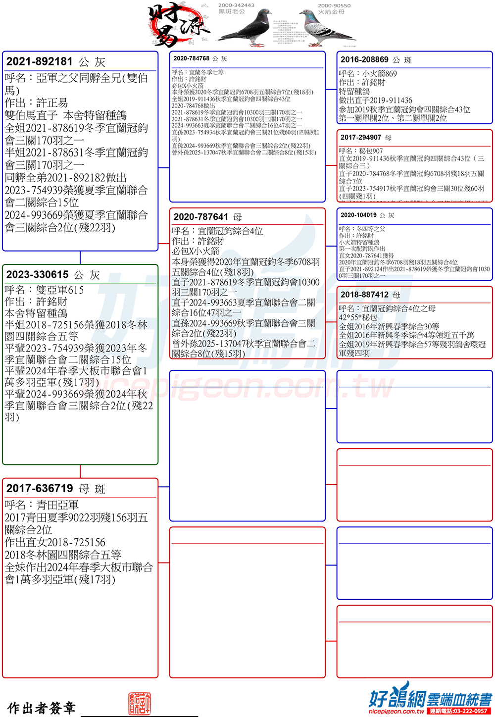 2025年夏季宜蘭聯合會二關綜合8位,環號25-137047灰♂,其父鴿24-993616斑♂,本身入賞夏季三關綜合7位(群益冠軍家族X小火箭三冠家族),母親24-333022,血統為夏季三關綜合亞軍全妹(雙伯馬家族X哈利近親)所作出,許銘財又一次以實戰成績印證了優質血統一脈相承的可貴。