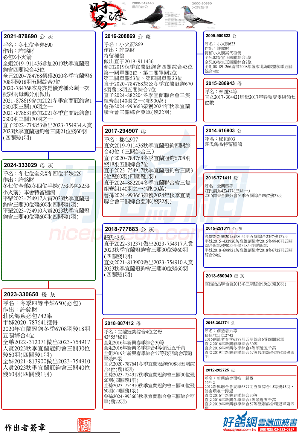 2025年夏季宜蘭聯合會二關綜合8位,環號25-137047灰♂,其父鴿24-993616斑♂,本身入賞夏季三關綜合7位(群益冠軍家族X小火箭三冠家族),母親24-333022,血統為夏季三關綜合亞軍全妹(雙伯馬家族X哈利近親)所作出,許銘財又一次以實戰成績印證了優質血統一脈相承的可貴。