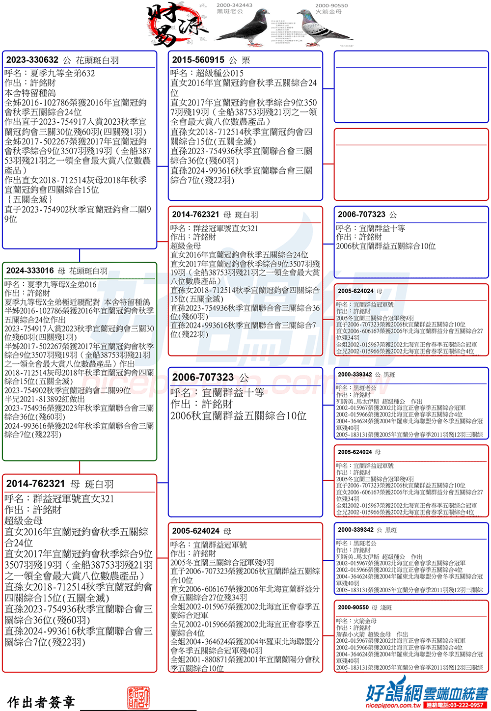 2025年夏季宜蘭聯合會二關綜合8位,環號25-137047灰♂,其父鴿24-993616斑♂,本身入賞夏季三關綜合7位(群益冠軍家族X小火箭三冠家族),母親24-333022,血統為夏季三關綜合亞軍全妹(雙伯馬家族X哈利近親)所作出,許銘財又一次以實戰成績印證了優質血統一脈相承的可貴。