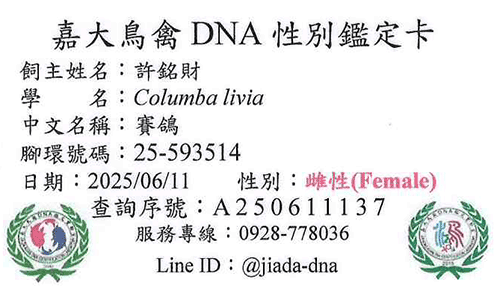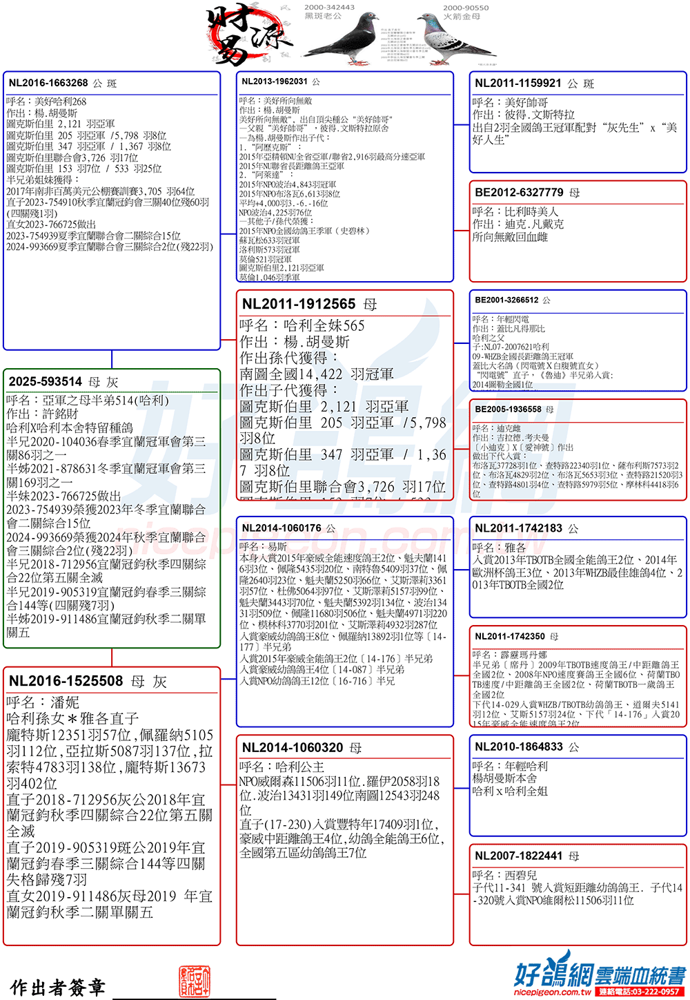2025年夏季宜蘭聯合會二關綜合8位,環號25-137047灰♂,其父鴿24-993616斑♂,本身入賞夏季三關綜合7位(群益冠軍家族X小火箭三冠家族),母親24-333022,血統為夏季三關綜合亞軍全妹(雙伯馬家族X哈利近親)所作出,許銘財又一次以實戰成績印證了優質血統一脈相承的可貴。