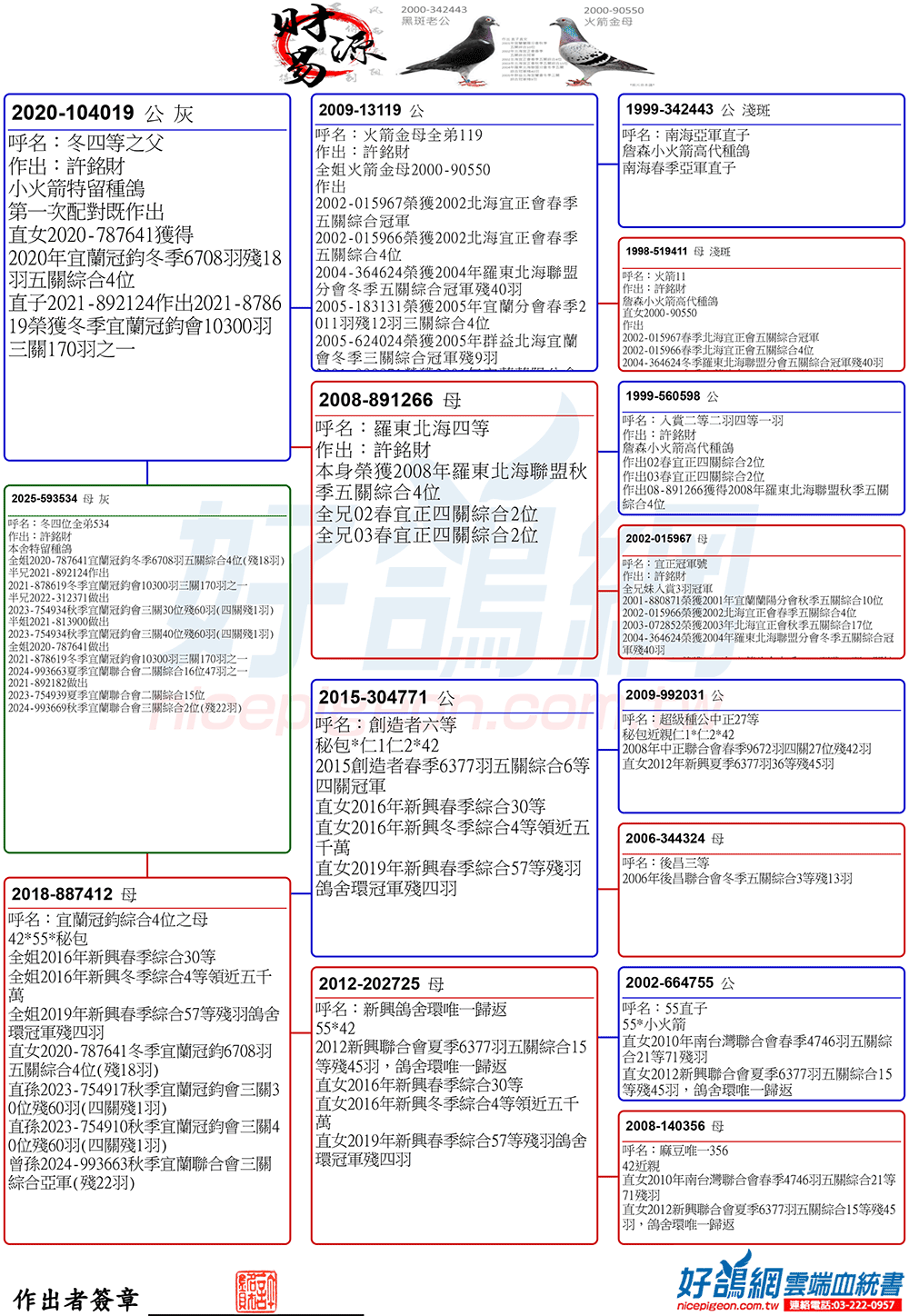 2025年夏季宜蘭聯合會二關綜合8位,環號25-137047灰♂,其父鴿24-993616斑♂,本身入賞夏季三關綜合7位(群益冠軍家族X小火箭三冠家族),母親24-333022,血統為夏季三關綜合亞軍全妹(雙伯馬家族X哈利近親)所作出,許銘財又一次以實戰成績印證了優質血統一脈相承的可貴。
