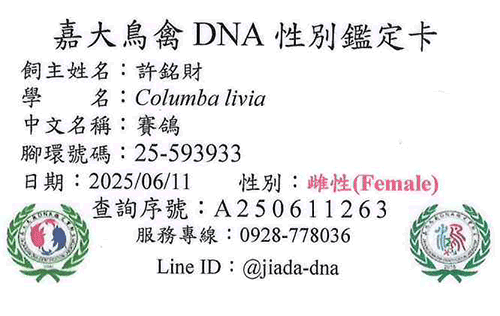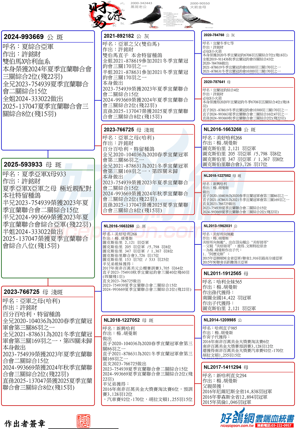 2025年夏季宜蘭聯合會二關綜合8位,環號25-137047灰♂,其父鴿24-993616斑♂,本身入賞夏季三關綜合7位(群益冠軍家族X小火箭三冠家族),母親24-333022,血統為夏季三關綜合亞軍全妹(雙伯馬家族X哈利近親)所作出,許銘財又一次以實戰成績印證了優質血統一脈相承的可貴。